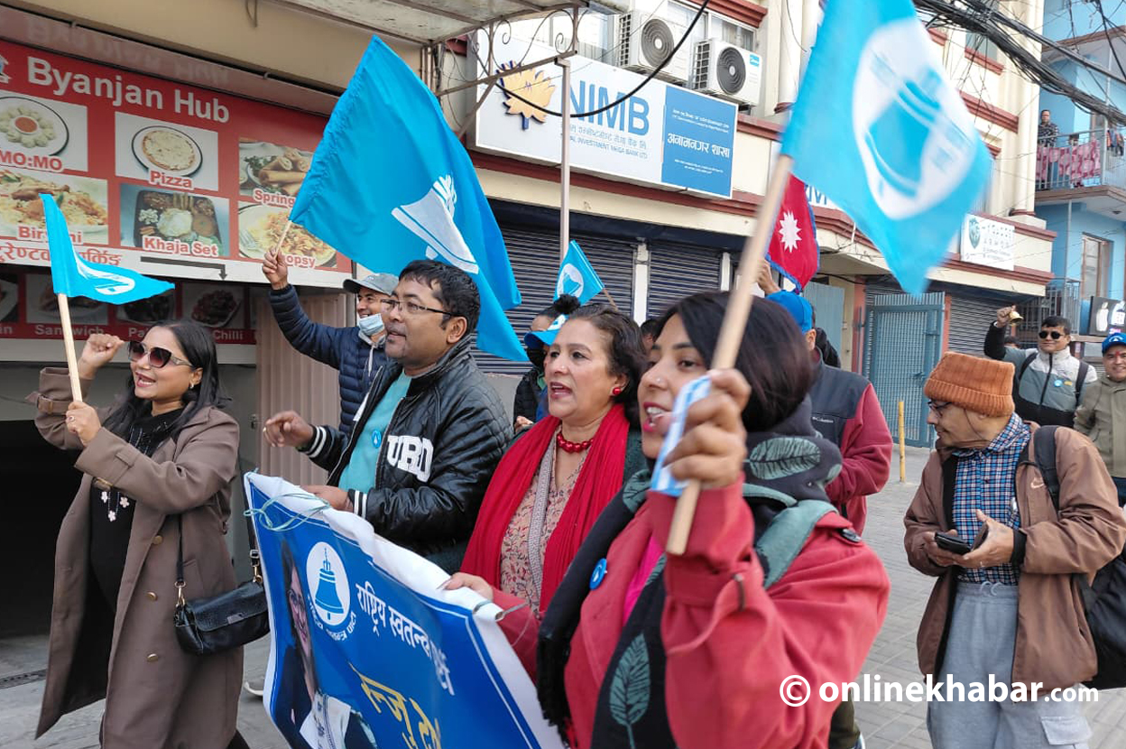 रास्वपाका कार्यकर्ता नाराबाजी गरिरहेका थिए– एक पटक, चुपचाप घण्टी छाप ।