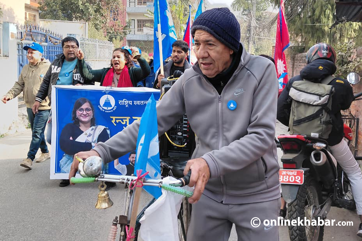 ‘क्षेत्र नम्बर १ ले के भन्छ, रन्जु दर्शना ले भन्छ,’ भन्दै माइकिङ चलिरह्यो । ‘रवि दाइको मान्छेलाई नचिन्ने…’ भन्दै संगीतमार्फत रास्वपा कार्याकर्ताले मतदातालाई आफूहरू ‘रवि दाइ’को मान्छे रहेको जनाउ दिइरह्यो । यसरी घरदैलोलाई साथ दिइरहेको स्पिकर साइकलमा लामो समयदेखि डोर्याइरहेका पात्र थिए, ७५ वर्षीय पृथ्वीबहादुर बस्नेत ।