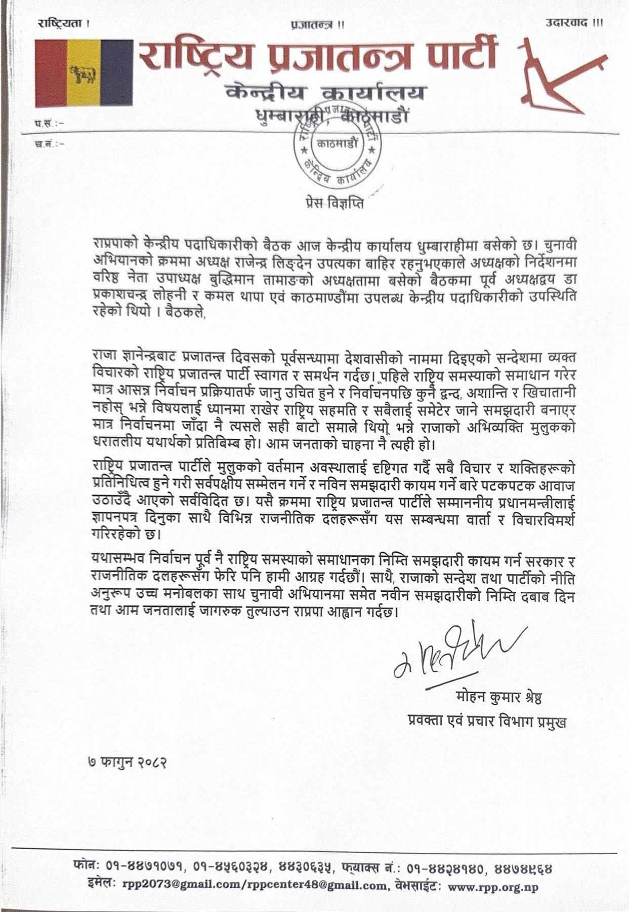 ‘पहिले राष्ट्रिय समस्याको समाधान गरेर मात्र आसन्न निर्वाचन प्रक्रियातर्फ जानु उचित हुने र निर्वाचनपछि कुनै द्वन्द, अशान्ति र खिचातानी नहोस् भन्ने विषयलाई ध्यानमा राखेर राष्ट्रिय सहमति र सबैलाई समेटेर जाने समझदारी बनाएर मात्र निर्वाचनमा जाँदा नै त्यसले सही बाटो समात्ने थियो भन्ने अभिव्यक्ति मुलुकको धरातलीय यथार्थको प्रतिबिम्ब हो। आम जनताको चाहना नै त्यही हो’राप्रपाले भनेको छ ।