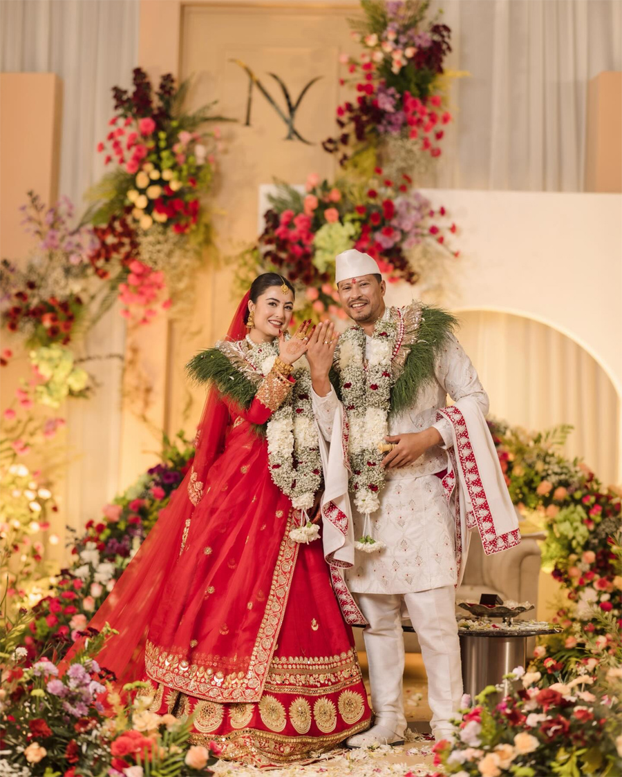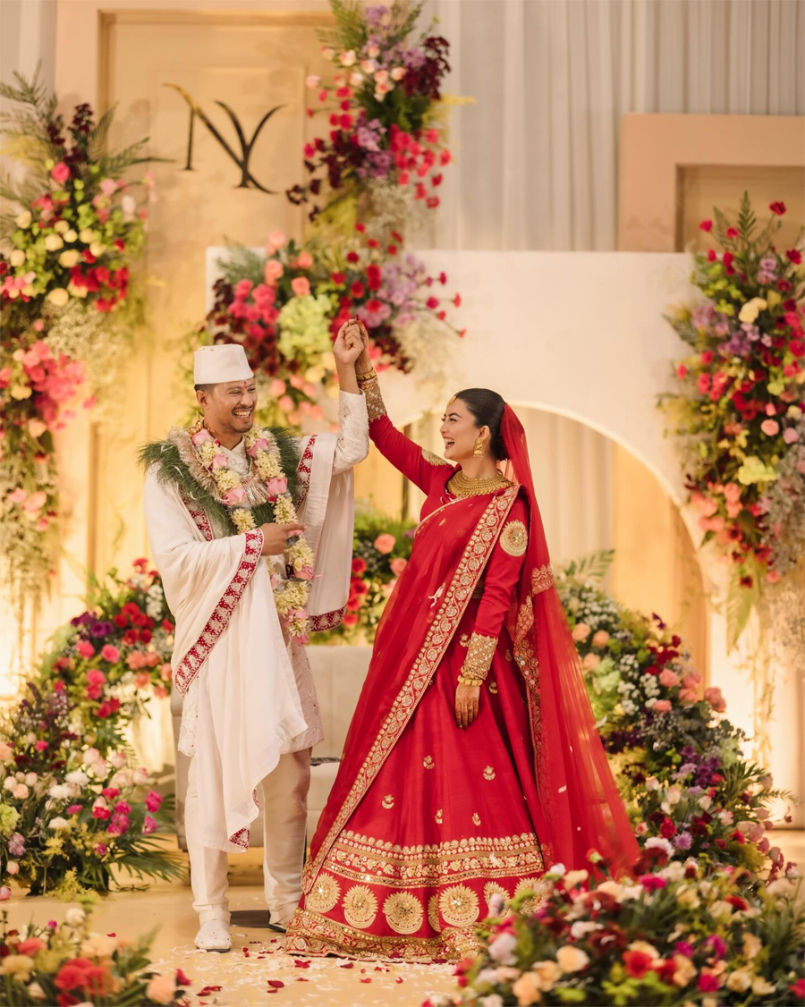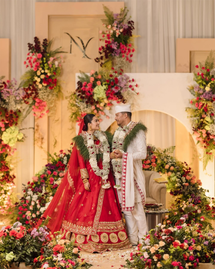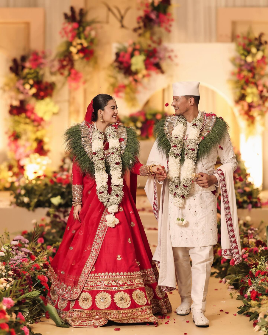• नीतिले विवाह समारोहमा मनीष राईले डिजाइन गरेको रातो ब्राइडल लहेंगा लगाएकी थिइन् भने दुलाहाले सेतो शेरवानी र टोपी लगाएका थिए।