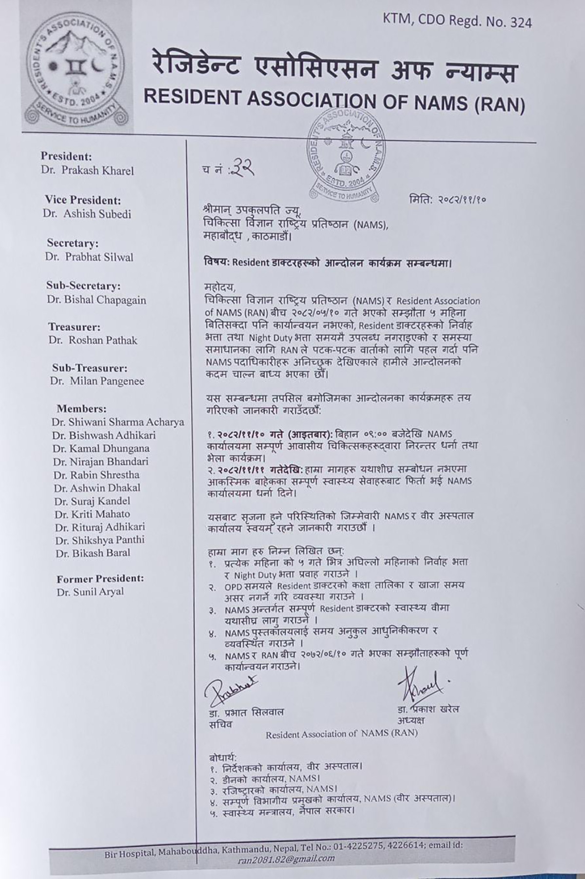 ‘रेजिडेन्स एसोसिएन अफ न्याम्सले प्रेस विज्ञप्ति जारी गरी आजबाट न्याम्सका सबै कार्यालयहरूमा धर्ना दिइ विरोध प्रदर्शन गरिरहेको जानकारी दिएको छ ।