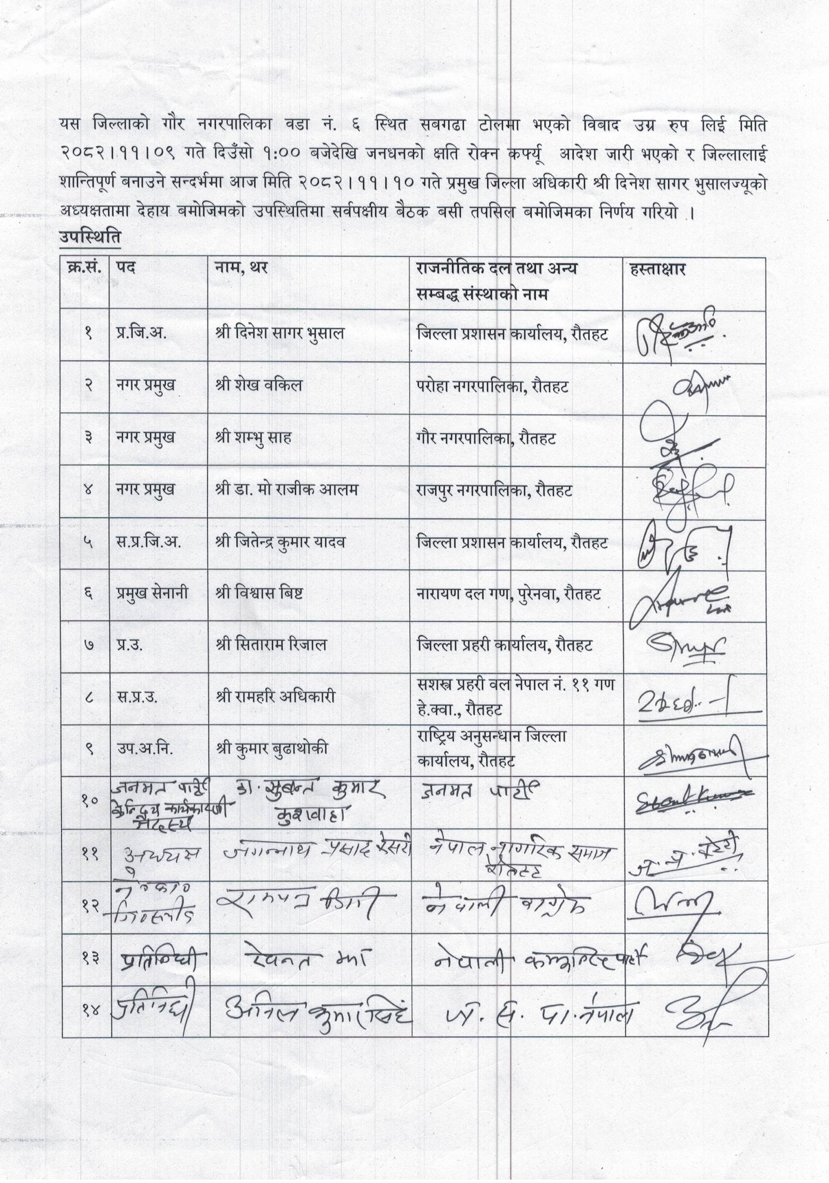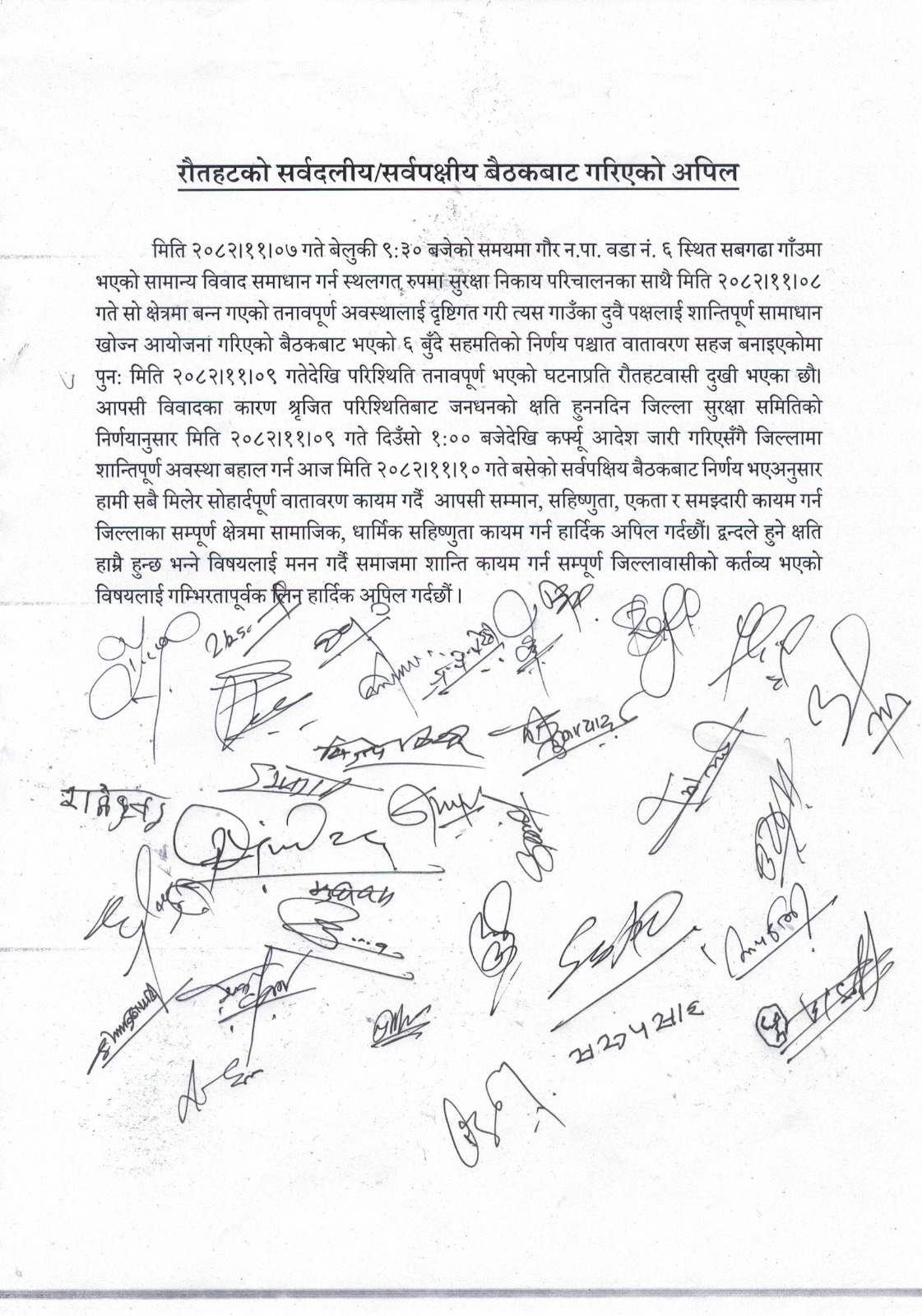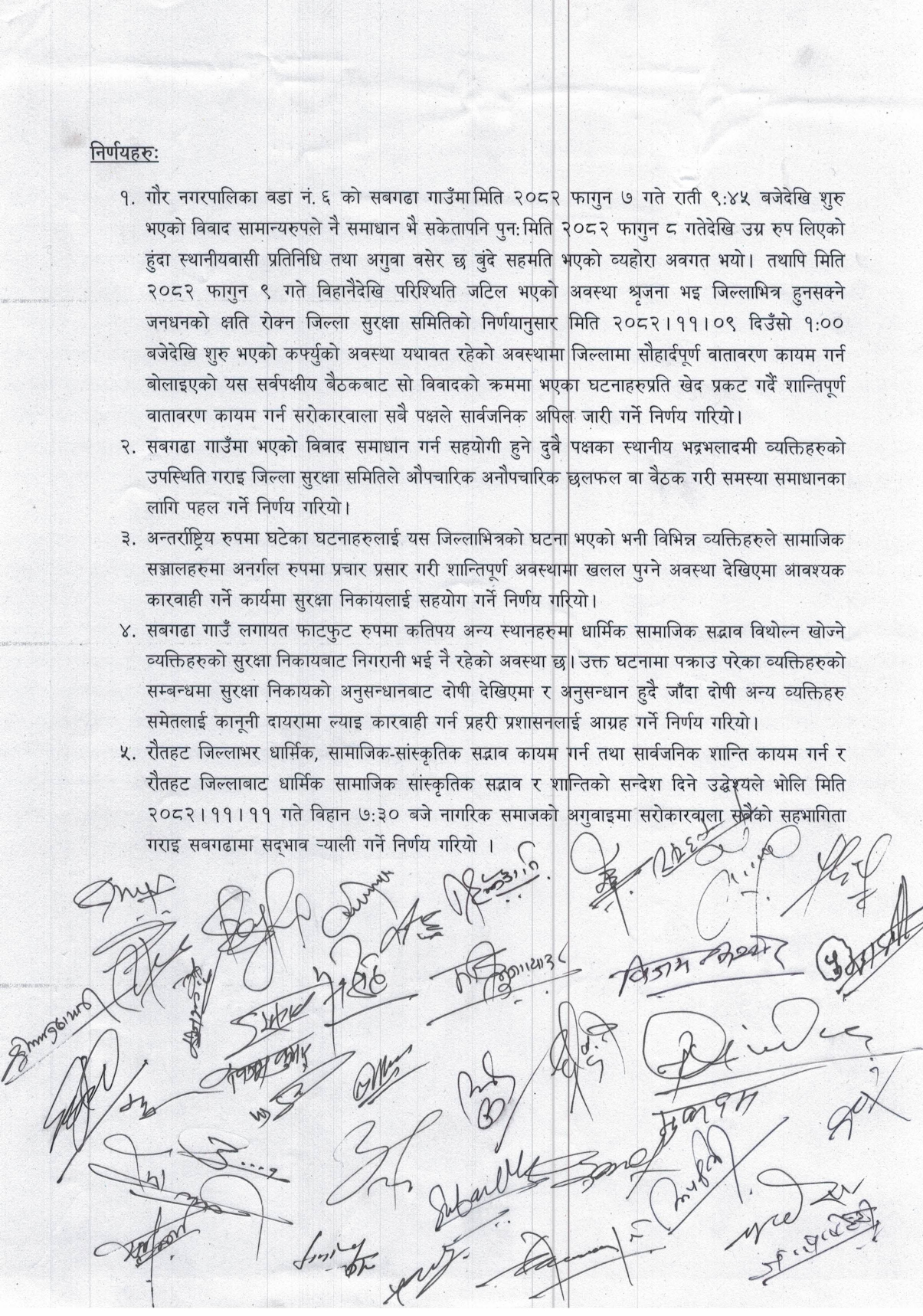 १. गौर नगरपालिका वडा नं. ६ को सबगढा गाउँमा मिति २०८२ फागुन ७ गते राति ९:४५ बजे सुरु भएको विवाद सामान्य रूपले नै समाधान भइसके पनि पुनः मिति २०८२ फागुन ८ गतेदेखि उग्र रूप लिएको हुँदा स्थानीयवासी प्रतिनिधि तथा अगुवा बसेर छबुँदे सहमति भएको बेहोरा अवगत भयो। तथापि मिति २०८२ फागुन ९ गते बिहानैदेखि परिस्थिति जटिल भएको अवस्था सिर्जना भई जिल्लाभित्र हुनसक्ने जनधनको क्षति रोक्न जिल्ला सुरक्षा समितिको निर्णयानुसार मिति २०८२।११।०९ दिउँसो १:०० बजेदेखि सुरु भएको कर्फ्युको अवस्था यथावत् रहेको अवस्थामा जिल्लामा सौहार्दपूर्ण वातावरण कायम गर्न बोलाइएको यस सर्वपक्षीय बैठकबाट सो विवादको क्रममा भएका घटनाहरूप्रति खेद प्रकट गर्दै शान्तिपूर्ण वातावरण कायम गर्न सरोकारवाला सबै पक्षले सार्वजनिक अपिल जारी गर्ने निर्णय गरियो।