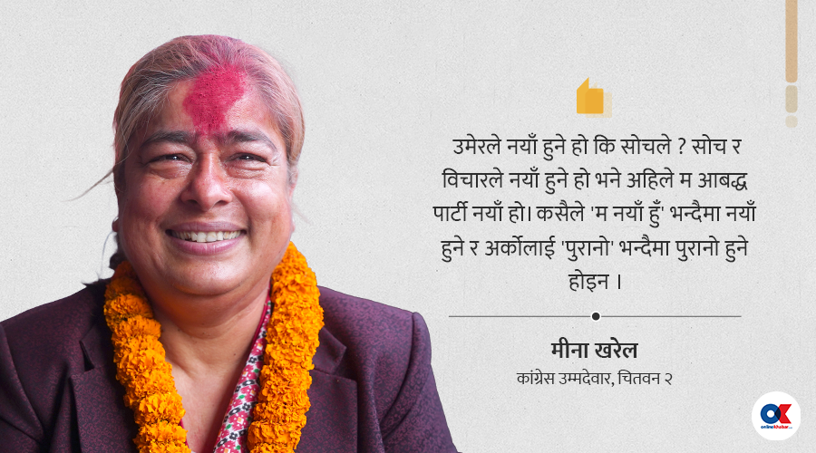 साढे तीन दशकदेखि महिला र बालबालिकाको क्षेत्रमा सक्रिय मीनाकुमारी खरेल २१ फागुनको निर्वाचनमा चितवन–२ मा आफू निर्वाचित हुने निश्चित भएको बताउँछिन् । आफ्नो उम्मेदवारीपछि नेपाली कांग्रेस तलदेखि माथिसम्म एकढिक्का भएको उनको भनाइ छ ।