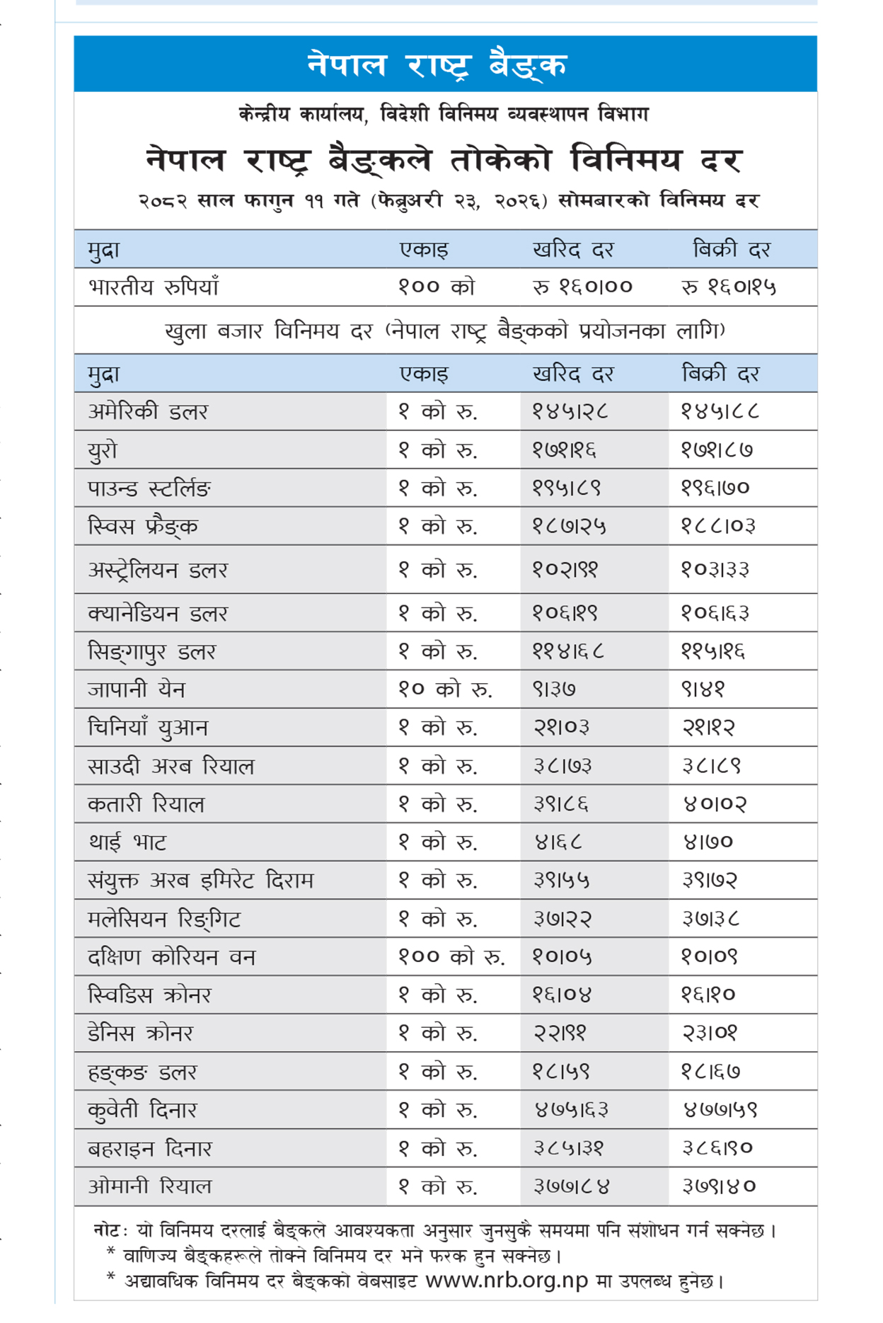 यस्तो छ आजका लागि विदेशी मुद्राको विनिमयदर