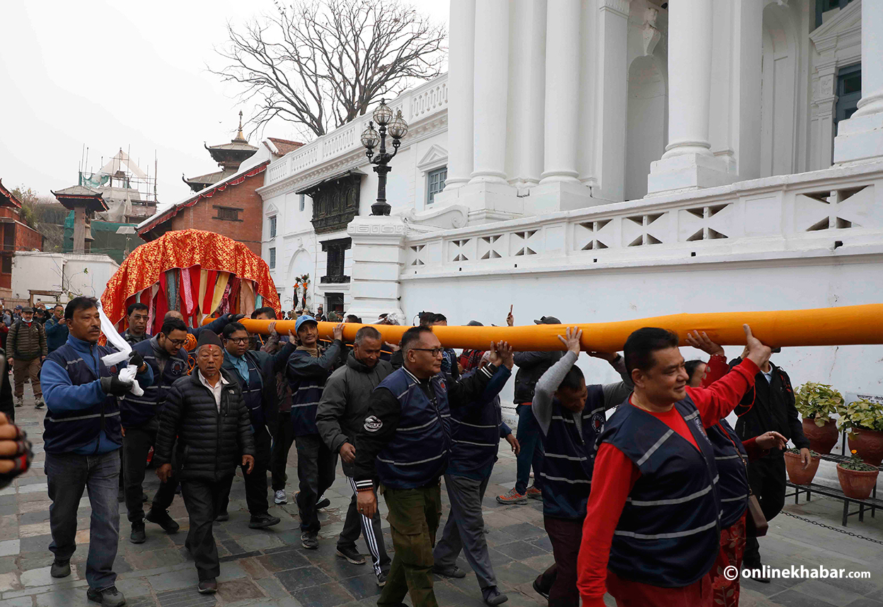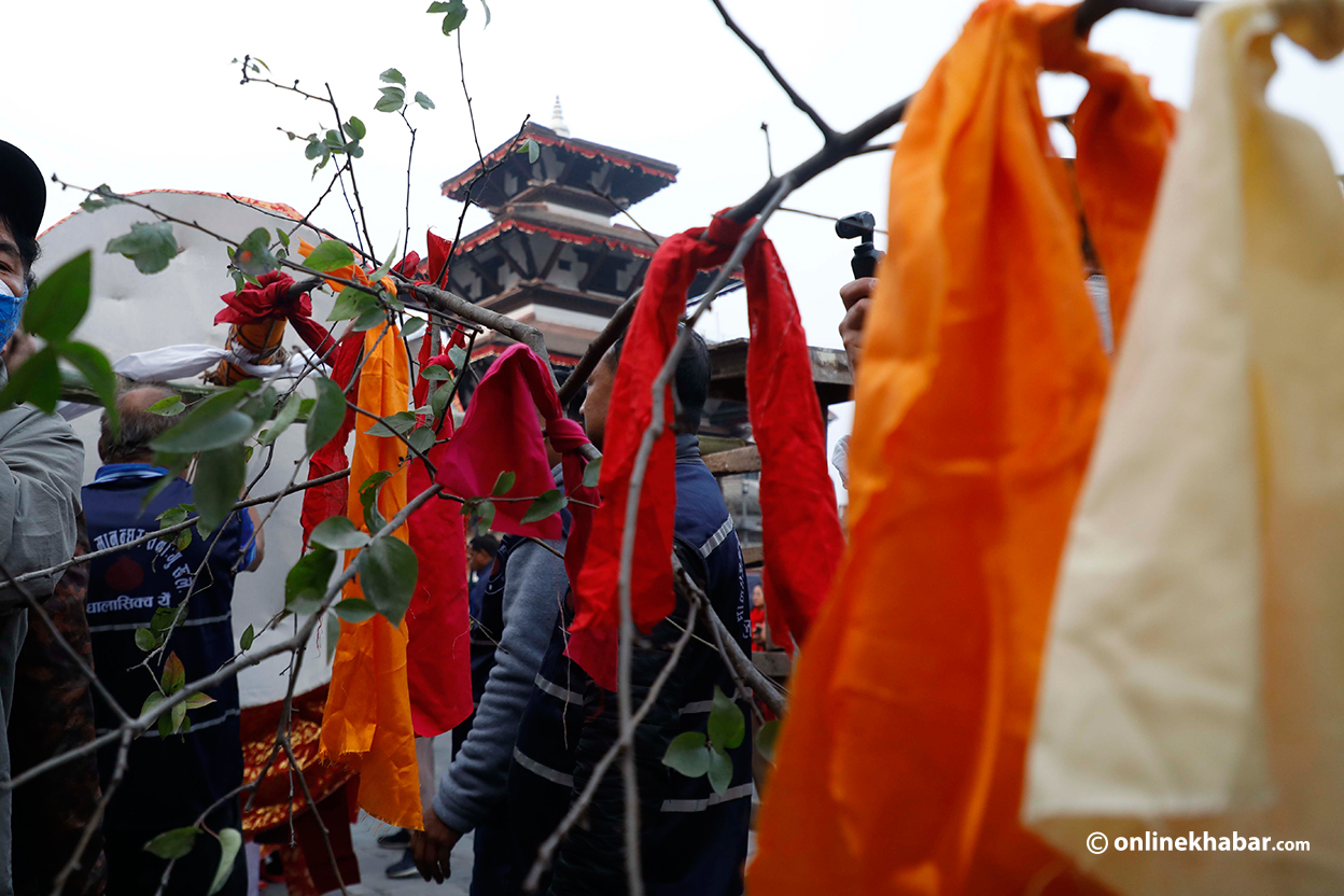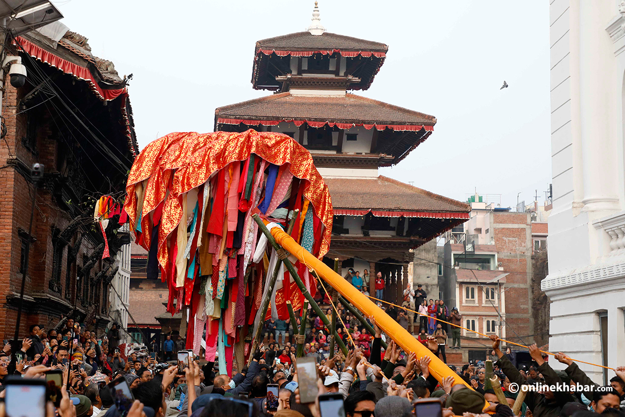 १२ फागुन, काठमाडौं । काठमाडौंको बसन्तपुरमा रङ्गीचङ्गी ध्वजाले सजाइएको तीनतले चीर ठड्याइएको छ । यससँगै आजबाट रङ्गहरुको पर्व होलीको उत्सव औपचारिक रुपमा सुरु भएको छ ।