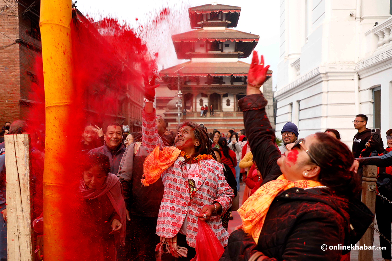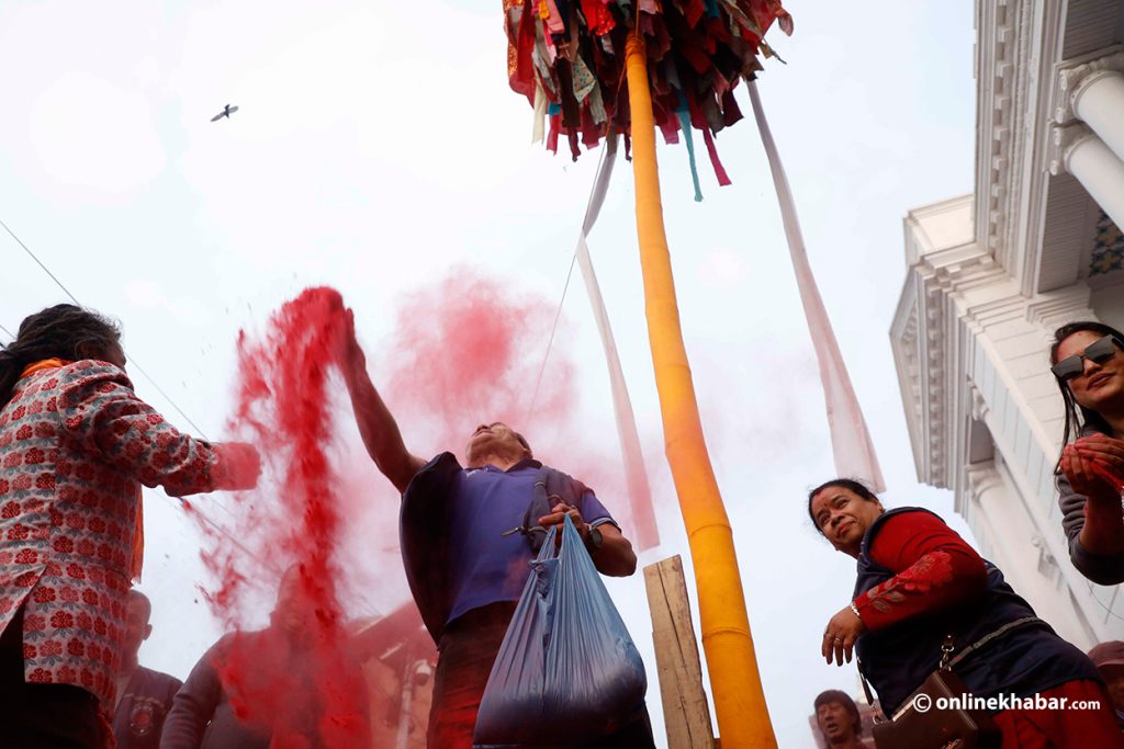 यही प्रचलन अनुसार मंगलबार बिहान मानन्धर समुदायले रंगीचंगी ध्वजासहितको चीर ठड्याएका छन् । साथै उनीहरुले एकअर्कालाई अबिर दलेर होली पर्व सुरु भएको जनाउ दिएका छन् ।