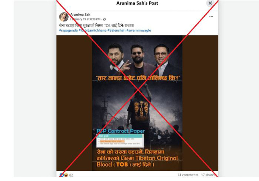 ५ हजार ९ सय फलोअर भएका अरुणिमा साह नामक फेसबुक प्रयोगकर्ताले फेब्रुअरी १९ राति ८:१८ बजे पोस्ट गरेको सामग्रीमा रवि लामिछाने, बालेन्द्र शाह र स्वर्णिम वाग्लेसहितको डिजाइन गरिएको ग्राफिक्स प्रयोग गरिएको छ।