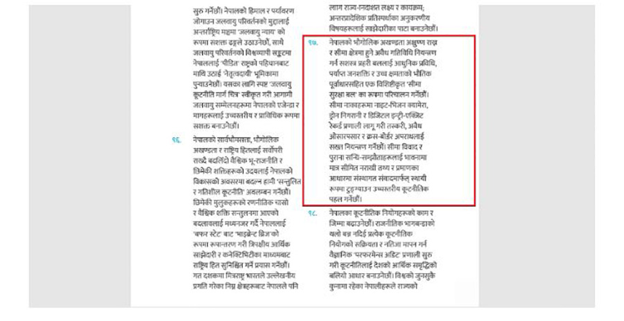 त्यसमा सीमा सुरक्षा शीर्षकमा सशस्त्र प्रहरी बललाई सीमा सुरक्षा बलमा परिणत गरिने, देशका सिमानामा काँडेतार लगाइने र सीमा विवादको छिटो अन्त्य गर्न अन्तर्राष्ट्रिय मञ्चमा पहल गरिने उल्लेख गरिएको छ।