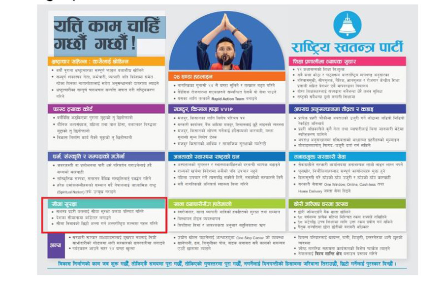 तथ्य : भ्रामक सूचना।   रास्वपाको आधिकारिक ‘बाचा पत्र २०८२’ तथा पूर्व सार्वजनिक प्रतिबद्धता सूची अध्ययन गर्दा उक्त विषय कतै उल्लेख भएको भेटिएन। रास्वपाको पुरानो ‘यति काम चाहिँ गर्छौँ’ शीर्षकको सूचीमा ‘देशका सिमानामा काँडेतार लगाइने’ उल्लेख गरिए पनि भन्दै सिमानामा काँडेतारको जिम्मा टिओबीलाई दिने कतै उल्लेख गरिएको छैन।