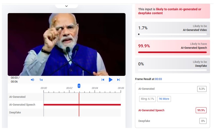 तर अडिओमा प्रयोग भएको आवाज (Speech) एआईमार्फत निर्मित भएको हुन सक्ने सम्भावना ९९ दशमलव ९ प्रतिशत दखायो। यसको अर्थ दृश्य नभई आवाज नक्कली हुनसक्छ।