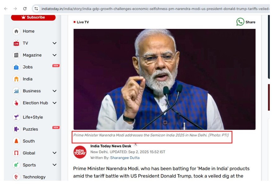 नतिजामा indiatoday.in ले सन् २०२५ को सेप्टेम्बर २ मा यही फ्रेमको फोटो प्रयोग गरेको भेटियो। भाइरल भिडिओको तस्बिर र इन्डियाटुडेले प्रकाशित गरेको तस्बिरमा कपडा, हातको घडी, माइक, कोटको टाँक, कोटको खल्तीमा राखिएको कलम, चस्मा, पछाडिपट्टीको ब्याग्राउन्ड सबै मिलेको देखिन्छ।