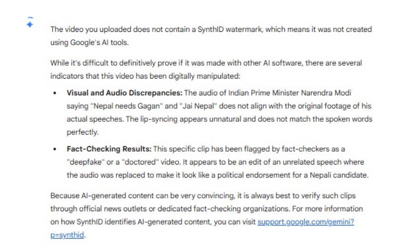तर भिडिओको प्रकृति हेर्दा र आवाज सुन्दा यो ‘डिपफेक’ (Deepfake) वा डिजिटल रूपमा परिवर्तन गरिएको जस्तो देखिएको नतिजा आयो। भिडियोमा ओठको चाल (Lip-syncing) र आवाजको लय अस्वाभाविक देखिने सम्भावनाबारे पनि गुगलको SynthID नतिजाले बतायो।