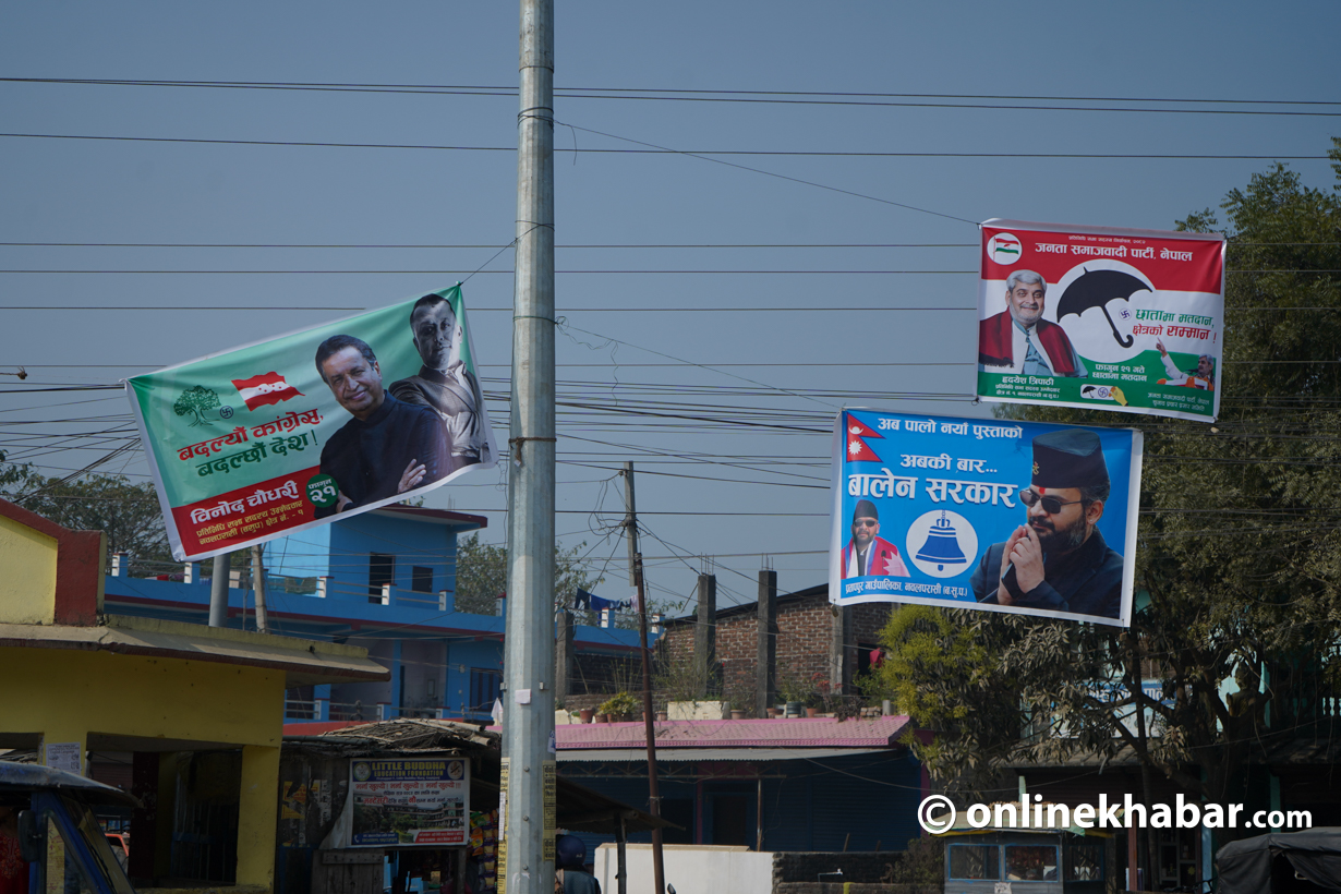 चुनावी प्रचारका लागि लहरै एकसाथ राखेका ब्यानरहरूले नवलपरासी (बर्दघाट–सुस्ता पश्चिम)–१ मा दलहरूका बीचमा रहेको सहिष्णुताको सन्देश पनि दिइरहेको थियो ।