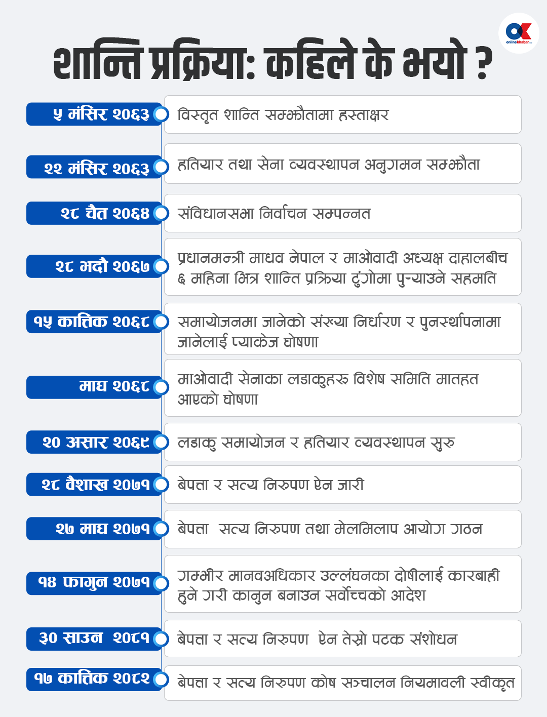 १ फागुन २०५२ बाट तत्कालीन नेकपा माओवादीले सशस्त्र युद्ध सुरु गरेको थियो । ५ मंसिर २०६३ मा नेपाल सरकार र तत्कालीन माओवादीबीच विस्तृत शान्ति सम्झौता भयो । त्यसपछि द्वन्द्व औपचारिक रूपमा अन्त्य भयो र संक्रमणकालीन न्यायको प्रक्रिया सुरु भयो ।