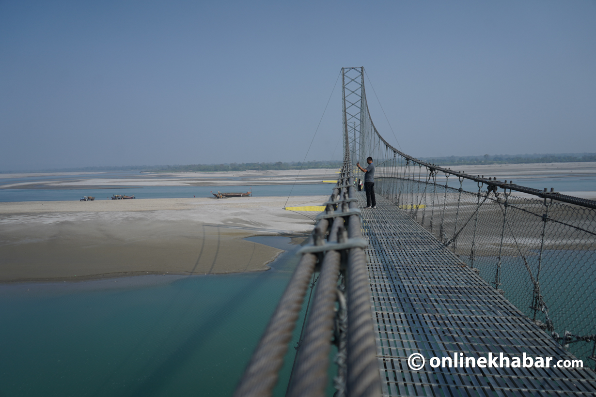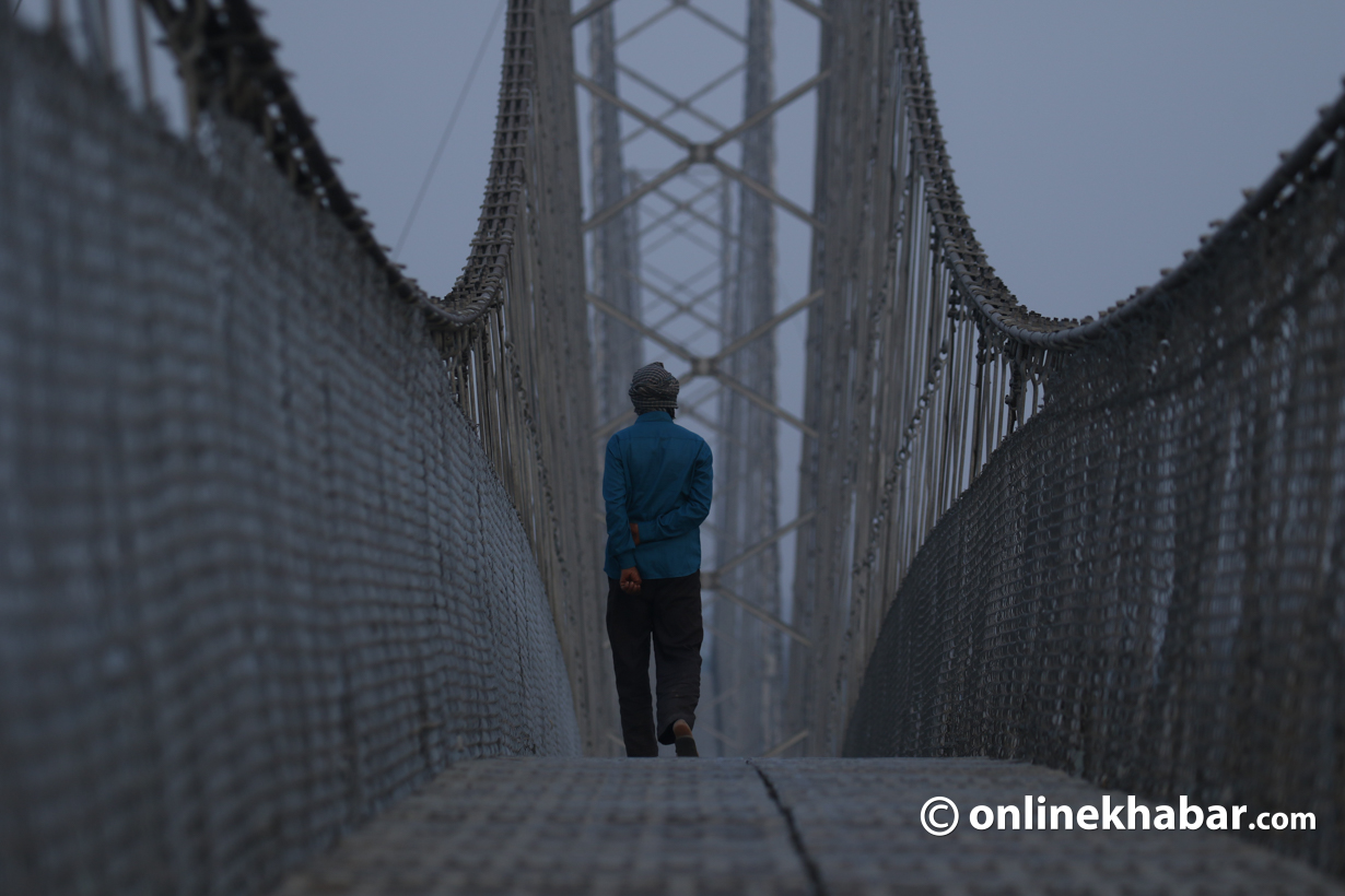 नारायणी नदीमाथिको १ हजार ५७१ मिटर लामो झेलुङ्गे पुलको पश्चिमी भागबाट पूर्वी भागमा पुग्न झन्डै आधा घण्टा समय लाग्दो रहेछ । पुलको पूर्वी भागबाट अस्ताउँदै गरेको सूर्यको तस्वीर कैद गर्न कतै दगुर्दा त कतै फटाफट हिँड्दा २१ मिनेट लाग्यो ।