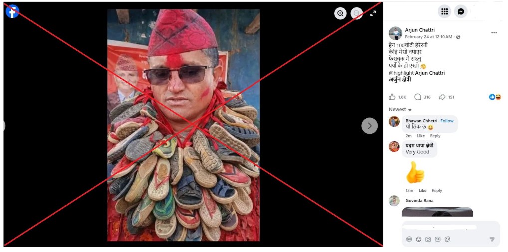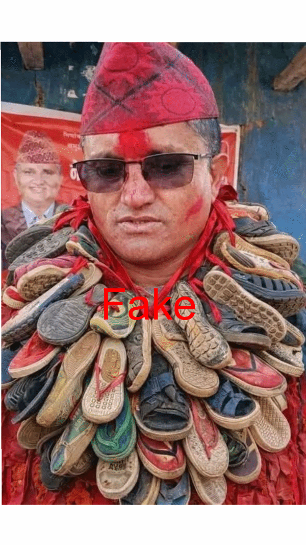 तथ्य : भ्रामक। भाइरल फोटो वास्तविक होइन। चुनावी भेटघाटको क्रममा खिचिएको मूल फोटोलाई डिजिटल रूपमा सम्पादन गरेर जुत्ताको माला जस्तो देखिने बनाइएको हाम्रो तथ्य जाँचबाट पुष्टि हुन्छ।