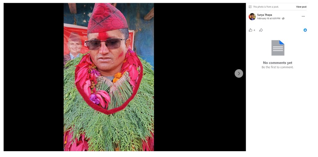 अर्जुन छत्री (Arjun Chattri) नामक फेसबुक प्रयोगकर्ताले मंगलबार (फेब्रुअरी २४, २०२५) एउटा फोटो पोस्ट गरेका छन्। उक्त फोटोमा सूर्य थापाले जुत्ताको माला लगाएको देखिन्छ।