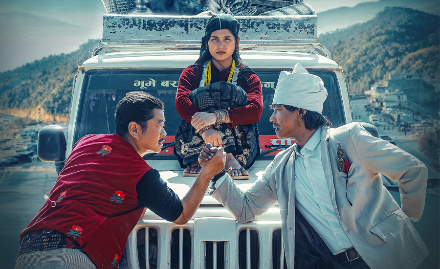 - पोस्टरमा दयाहाङ राई र सौगात मल्ल पञ्जा जुधाइरहेका छन् भने तेरिया मगर निराश भावमा जिपमाथि बसेकी छिन्।