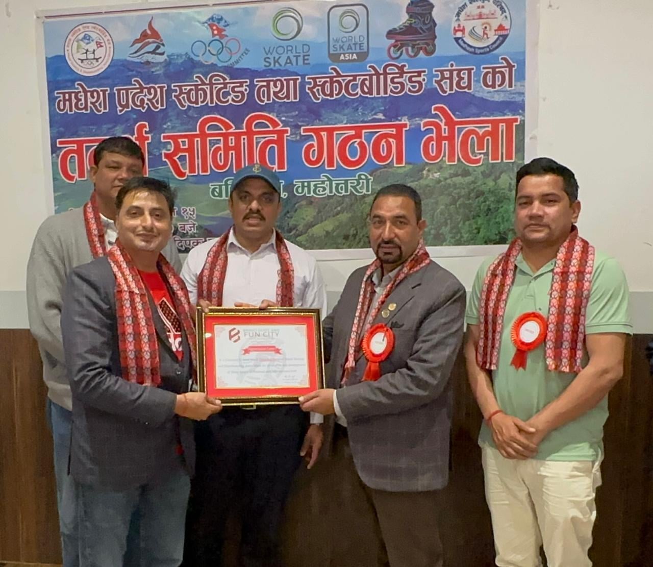 मधेश स्केटिङ तथा स्केटबोर्डिङ एसोसिएसन तदर्थ समिति गठनको अवसरमा नेपाल स्केटिङ तथा स्केटबोर्डिङ एसोसिएसनका केन्द्रिय अध्यक्ष अच्युत खनाल, महासचिव सत्य थापा तथा प्रमुख प्रशिक्षक दिलिप राज बराल, मधेश खेलकुद परिषदका निर्देशकद्वय प्रभु नारायण सिवाकोटी र भरत प्रसाद यादवसँगै र नेपाल बेसबल एसोसिएसनका अध्यक्ष दीपक न्यौपानेको उपस्थिति थियो ।