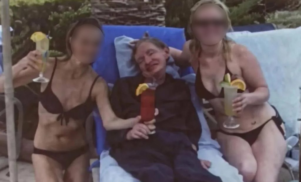 उक्त तस्बिर सामाजिक सञ्जालमा तीव्र रूपमा भाइरल भइरहेको छ, किनकि त्यसमा वैज्ञानिक हकिङ एउटा आरामदायक कुर्सीमा बसेका छन् र उनको दायाँबायाँ बिकनीमा दुई कामुक महिला उभिएका छन् । हकिङको हातमा रातो रङको कक्टेल देखिन्छ ।