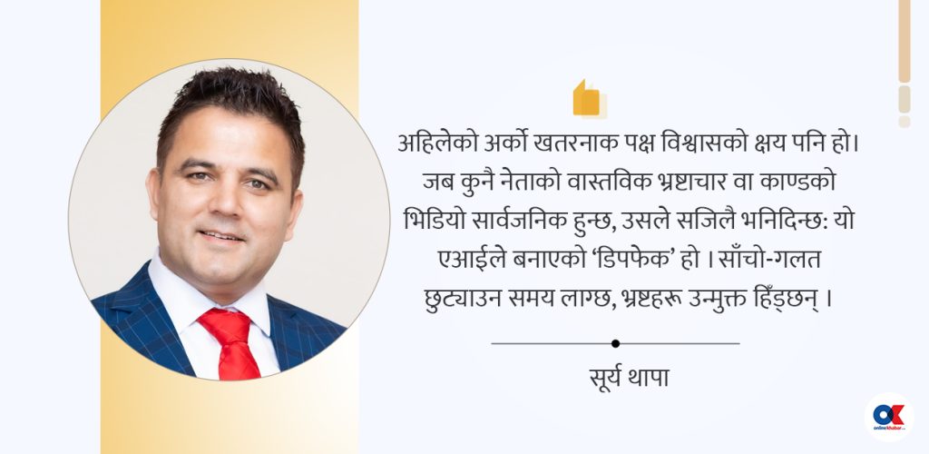 अहिलेको अर्को खतरनाक पक्ष विश्वासको क्षय पनि हो। जब कुनै नेताको वास्तविक भ्रष्टाचार वा काण्डको भिडियो सार्वजनिक हुन्छ, उसले सजिलै भनिदिन्छ: यो एआईले बनाएको ‘डिपफेक’ हो । कुन साँचो र कुन गलत भनेर छुट्याउन समय लाग्छ, भ्रष्टहरू उन्मुक्त भएर हिँड्छन् ।