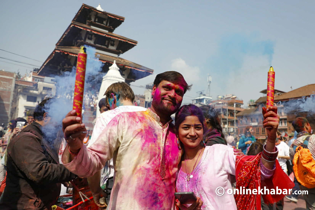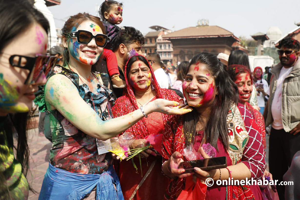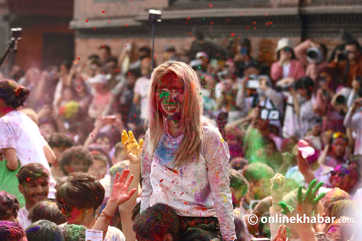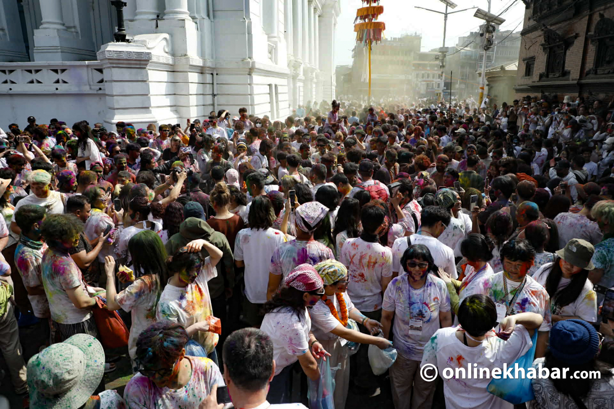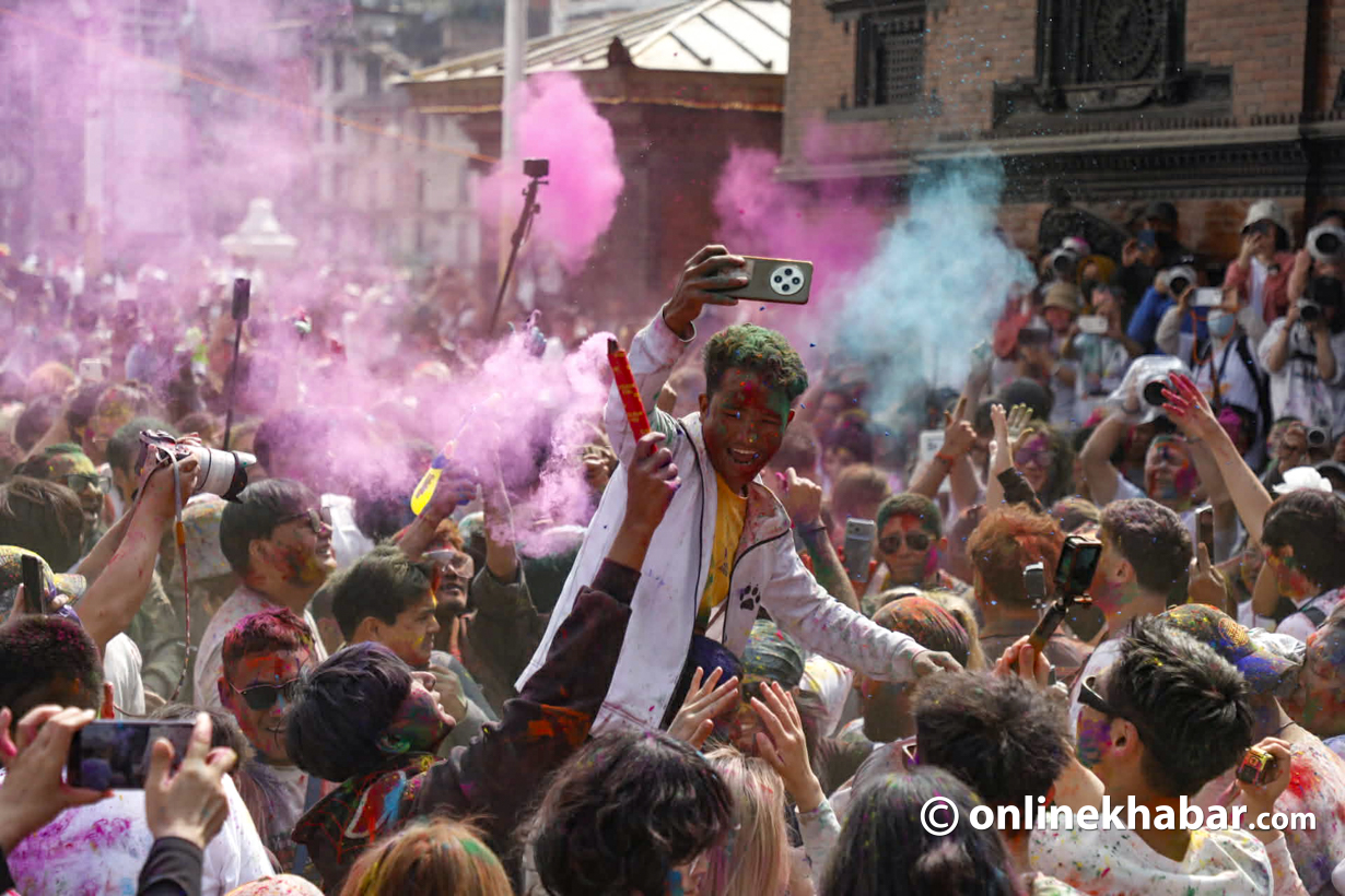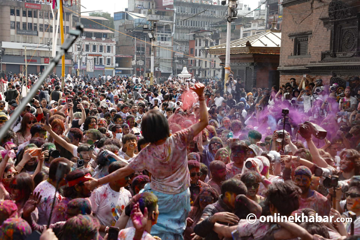 काठमाडौंको वसन्तपुर दरबार क्षेत्र, टुँडिखेल, ठमेल, दरबारमार्गलगायत उपत्यकाका विभिन्न क्षेत्रमा धुमधाम होली मनाइएको छ ।