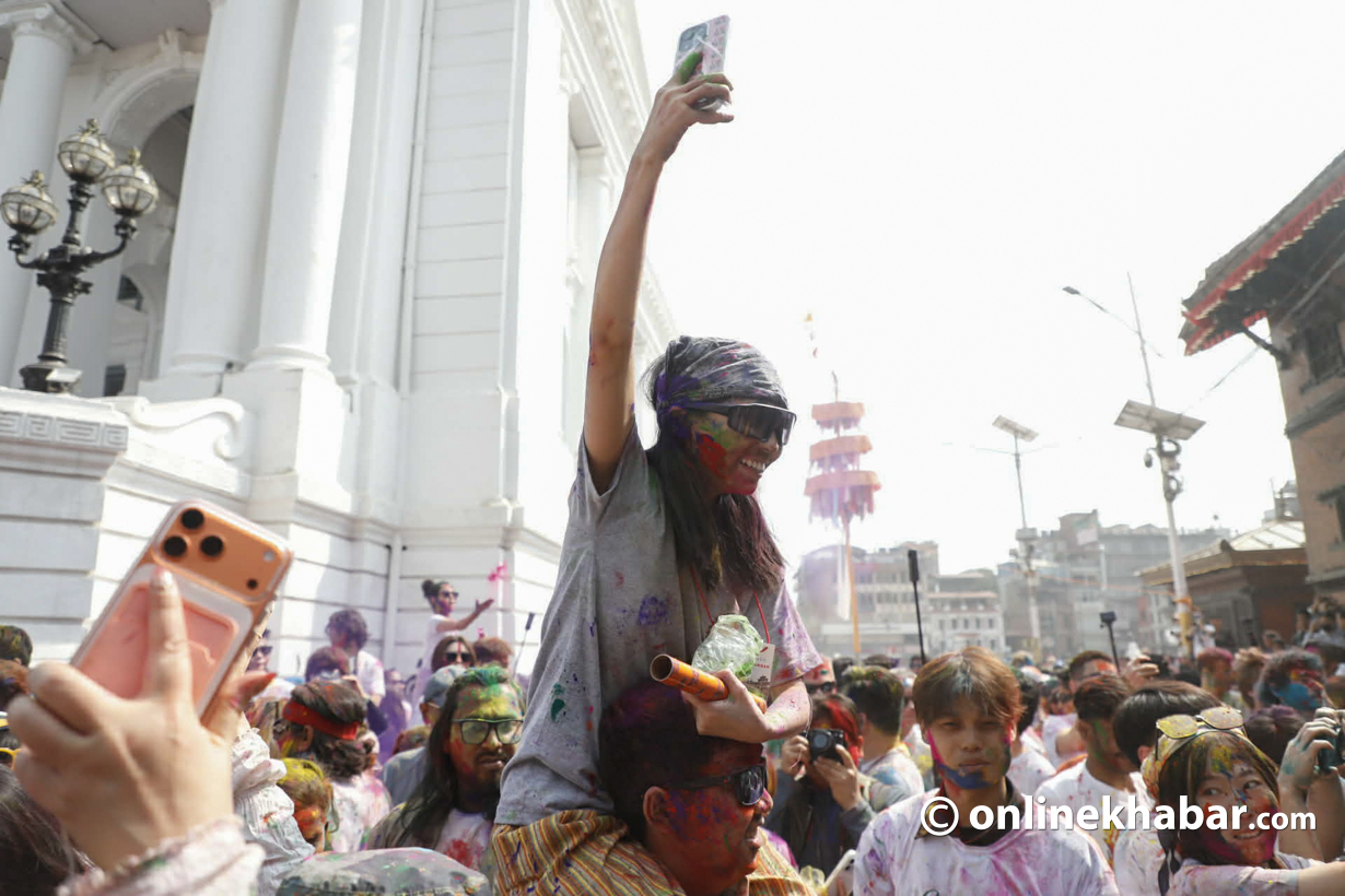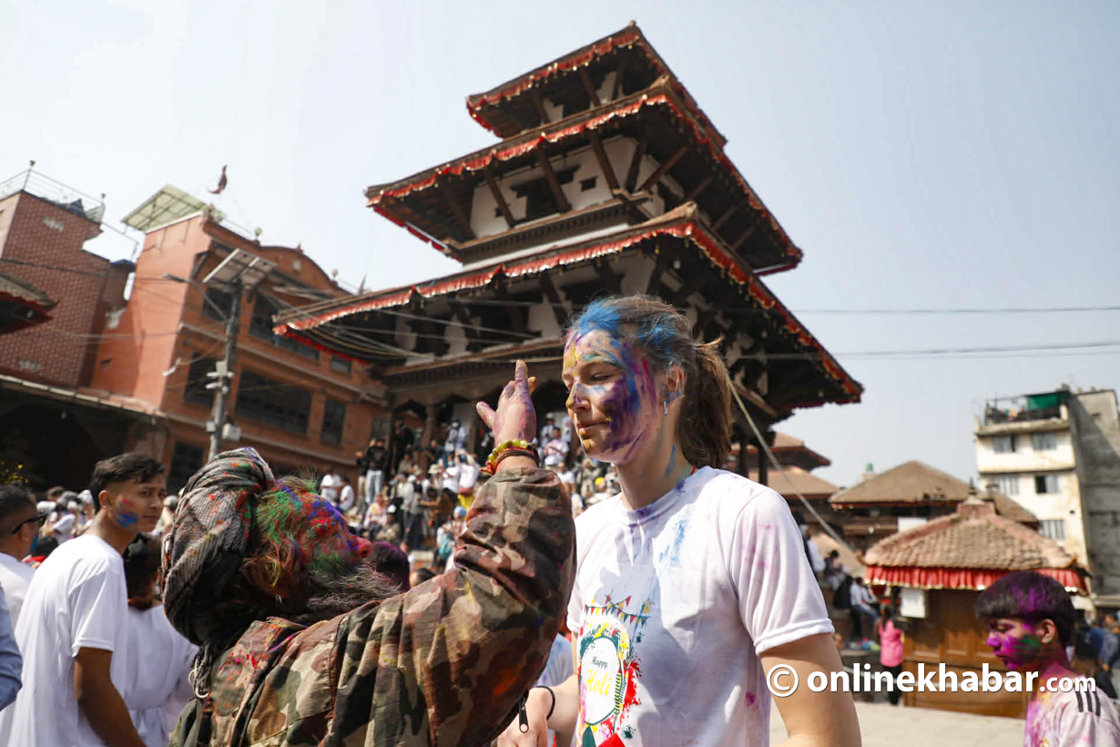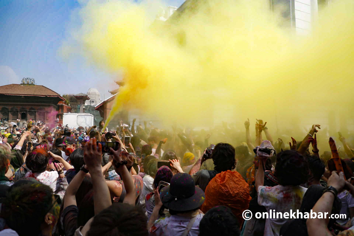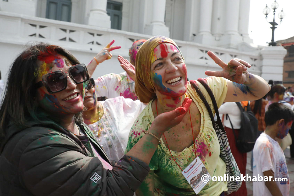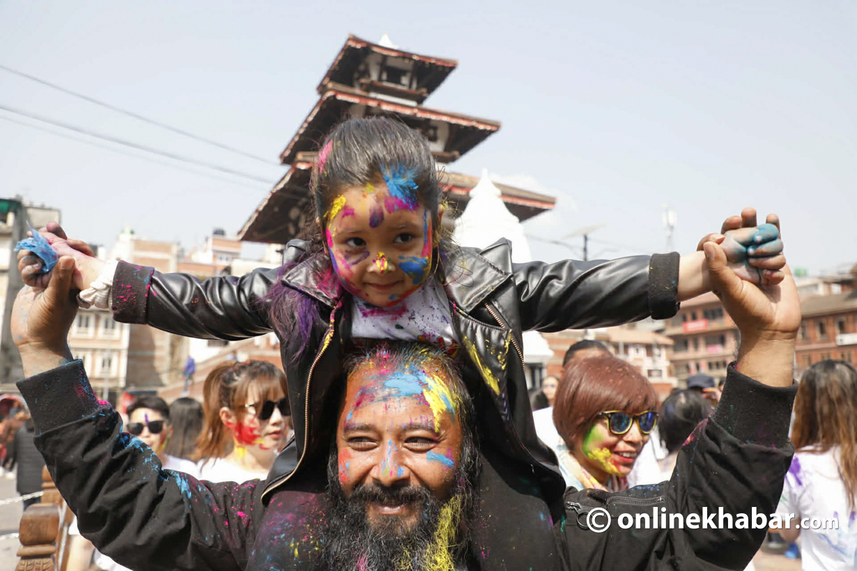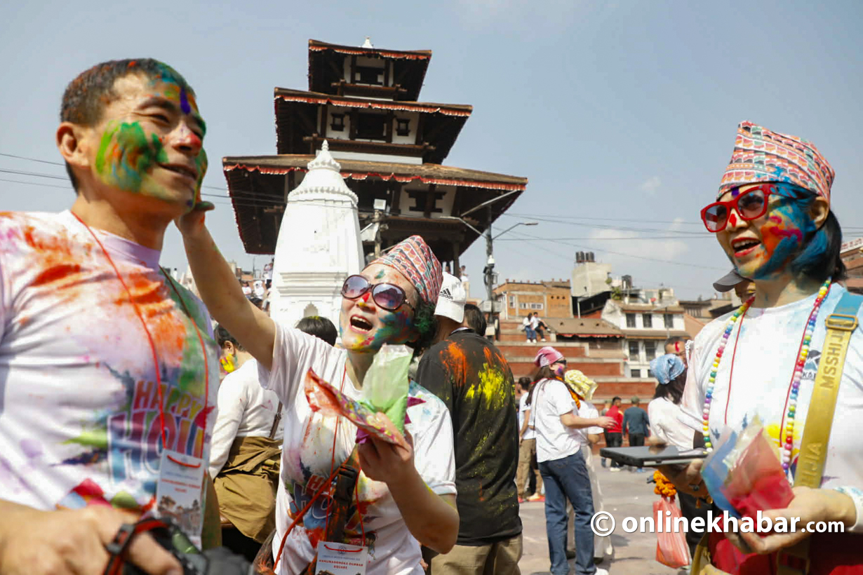 काठमाडौंको वसन्तपुर दरबार क्षेत्र, टुँडिखेल, ठमेल, दरबारमार्गलगायत उपत्यकाका विभिन्न क्षेत्रमा धुमधाम होली मनाइएको छ ।