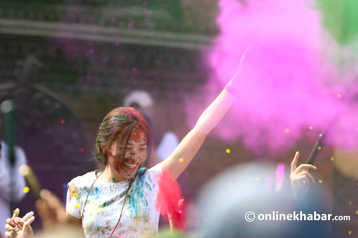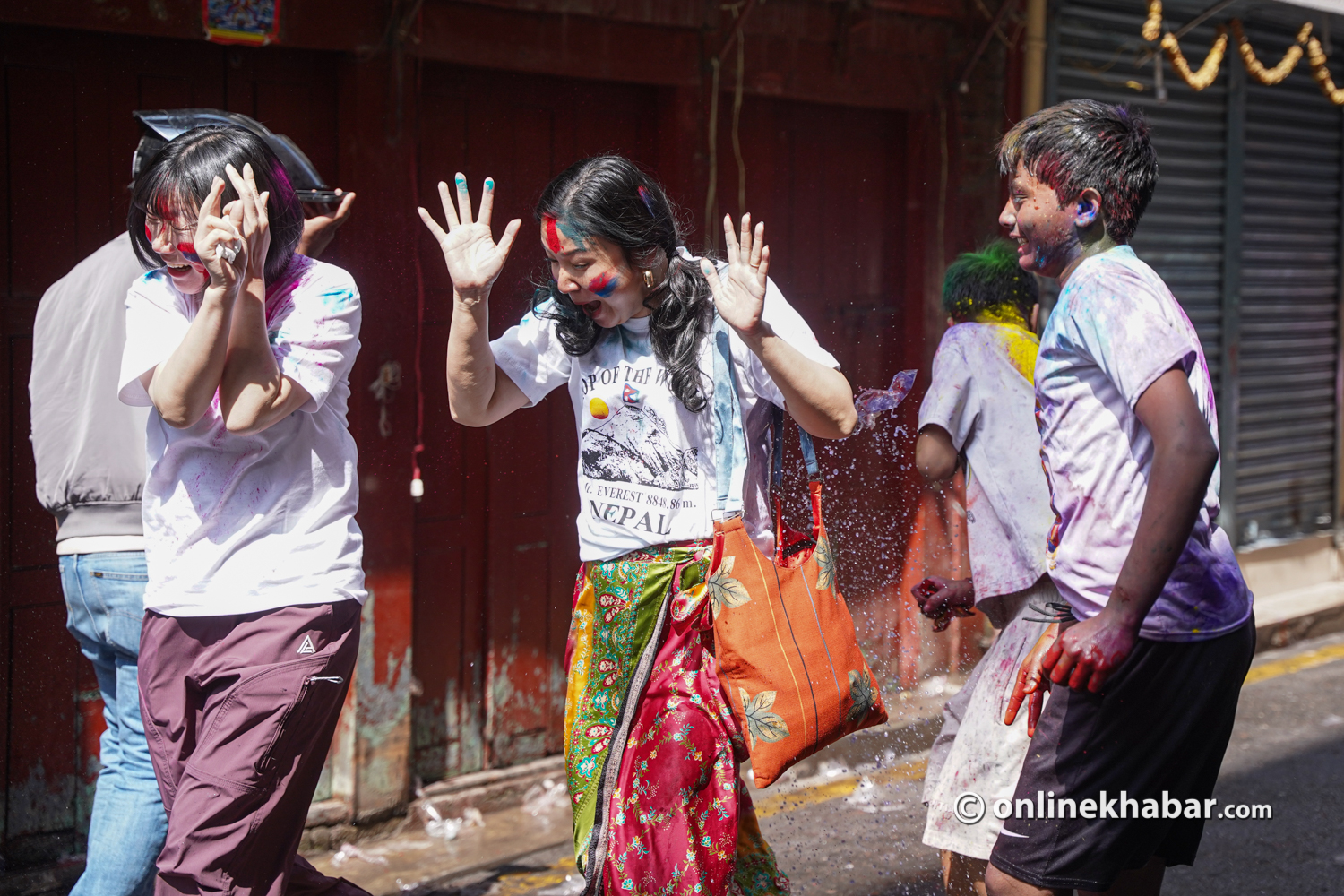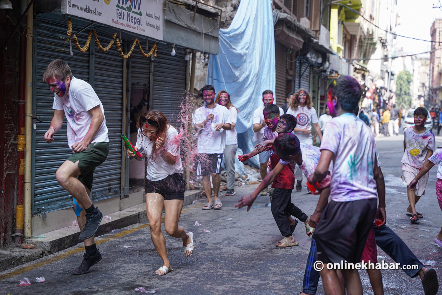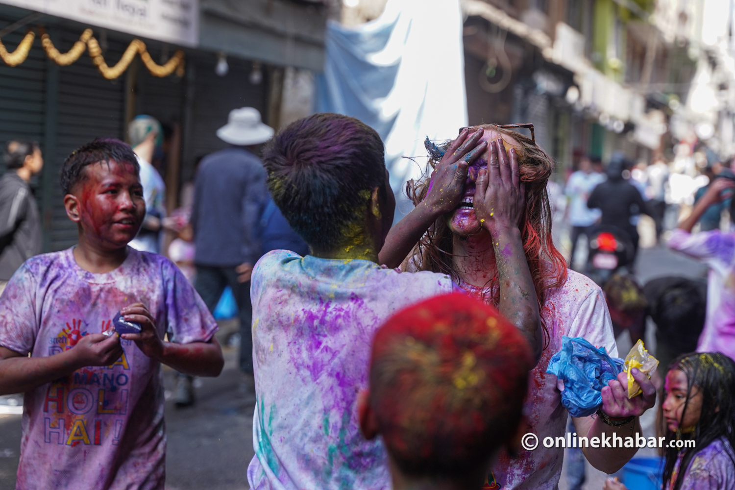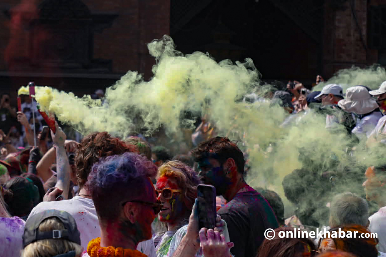 काठमाडौंको वसन्तपुर दरबार क्षेत्र, टुँडिखेल, ठमेल, दरबारमार्गलगायत उपत्यकाका विभिन्न क्षेत्रमा धुमधाम होली मनाइएको छ ।
