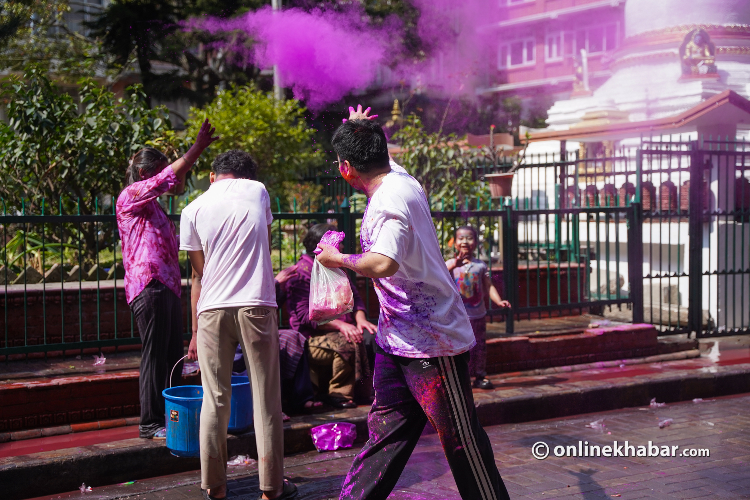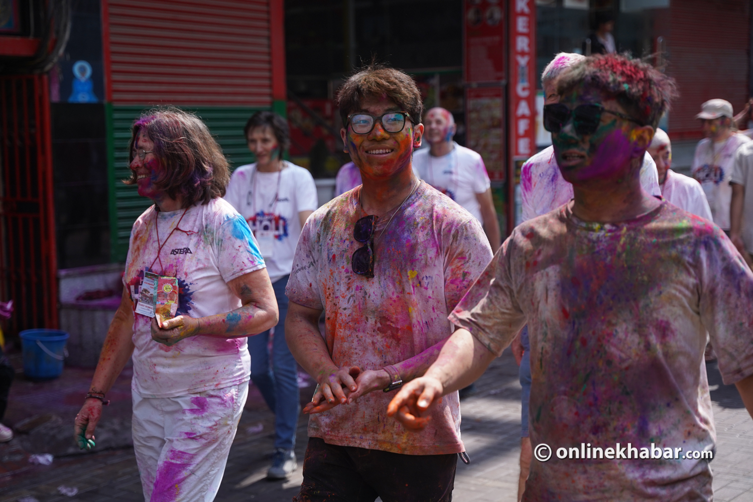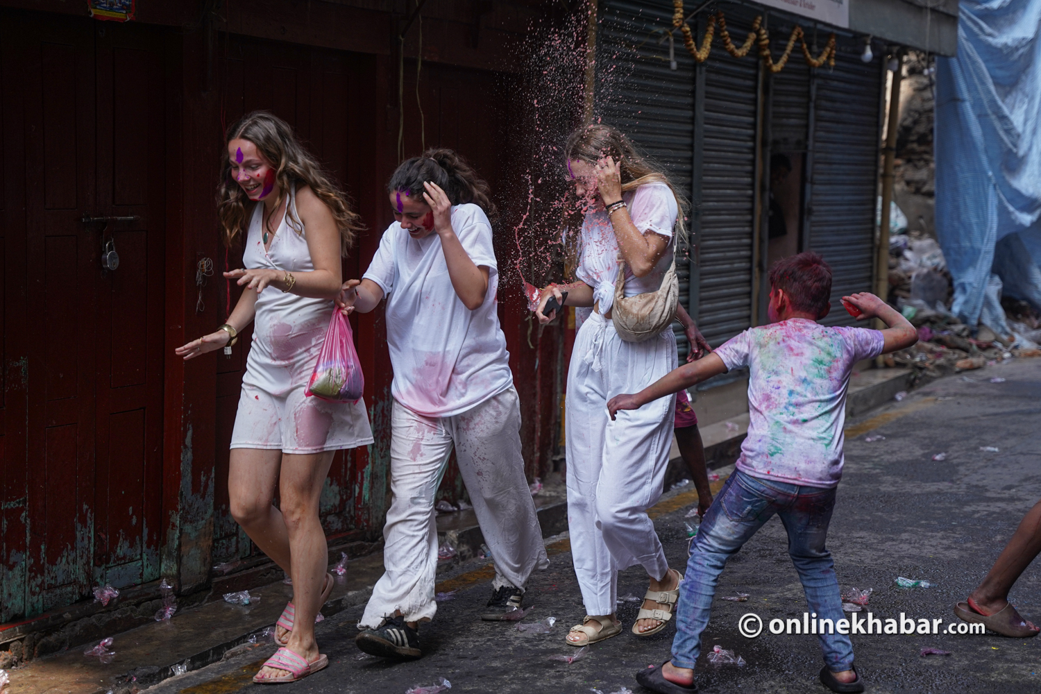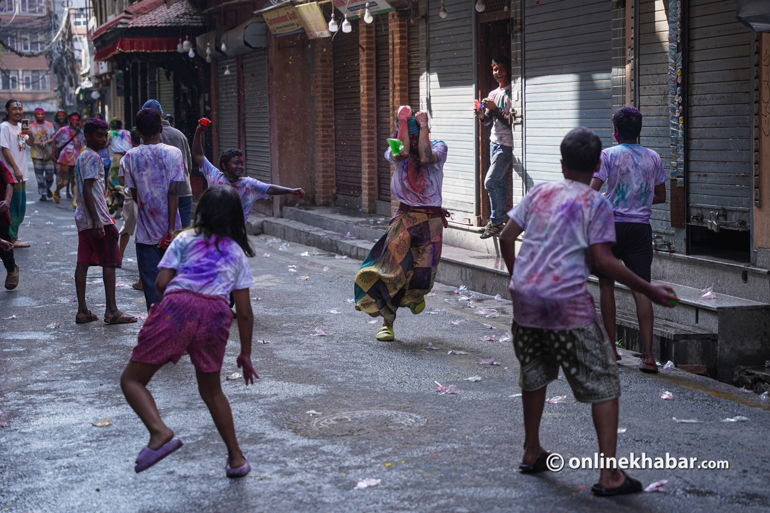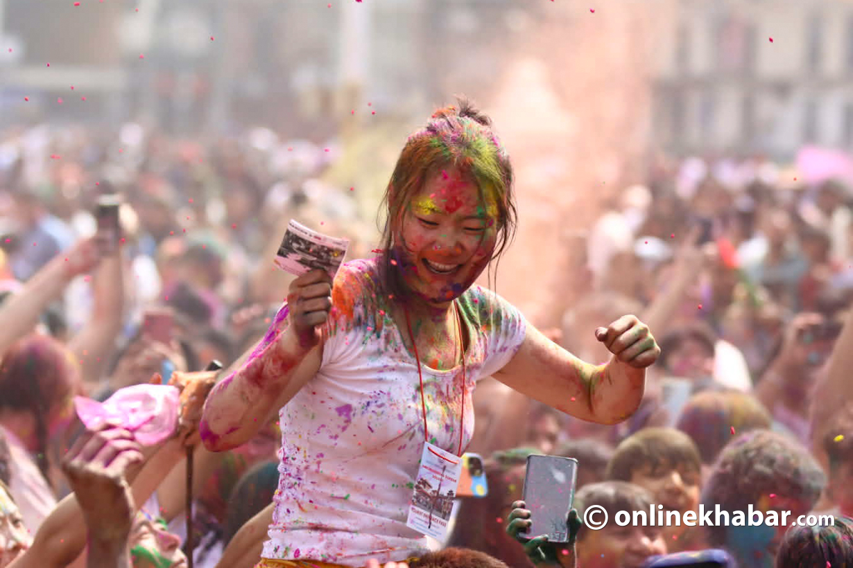काठमाडौंको वसन्तपुर दरबार क्षेत्र, टुँडिखेल, ठमेल, दरबारमार्गलगायत उपत्यकाका विभिन्न क्षेत्रमा धुमधाम होली मनाइएको छ ।