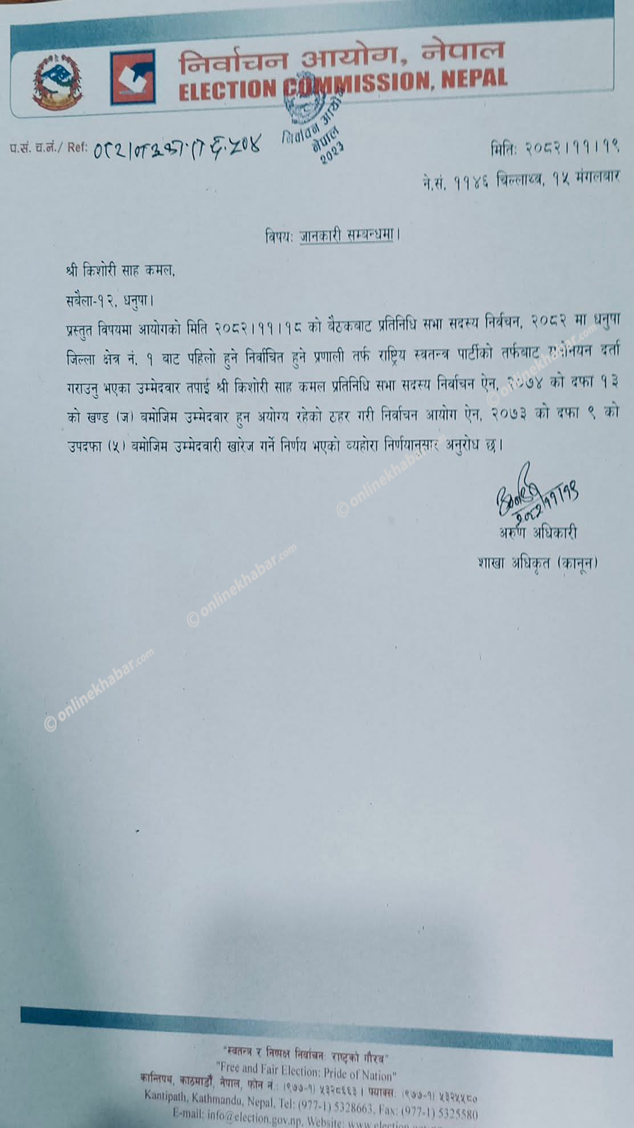 निर्वाचन आयोगका कार्यवहाक प्रमुख आयुक्त रामप्रसाद भण्डारीले धनुषा क्षेत्र नम्बर १ का उम्मेदवार साहको उम्मेदवारी खारेज गर्ने निर्णय भएको पुष्टि गरे ।