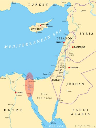 मध्यपूर्वको नक्सा र रातोमा सुएज नहर भएको क्षेत्र