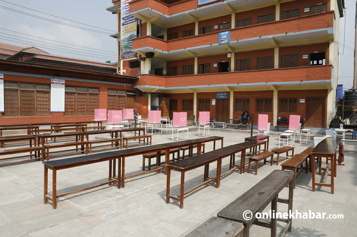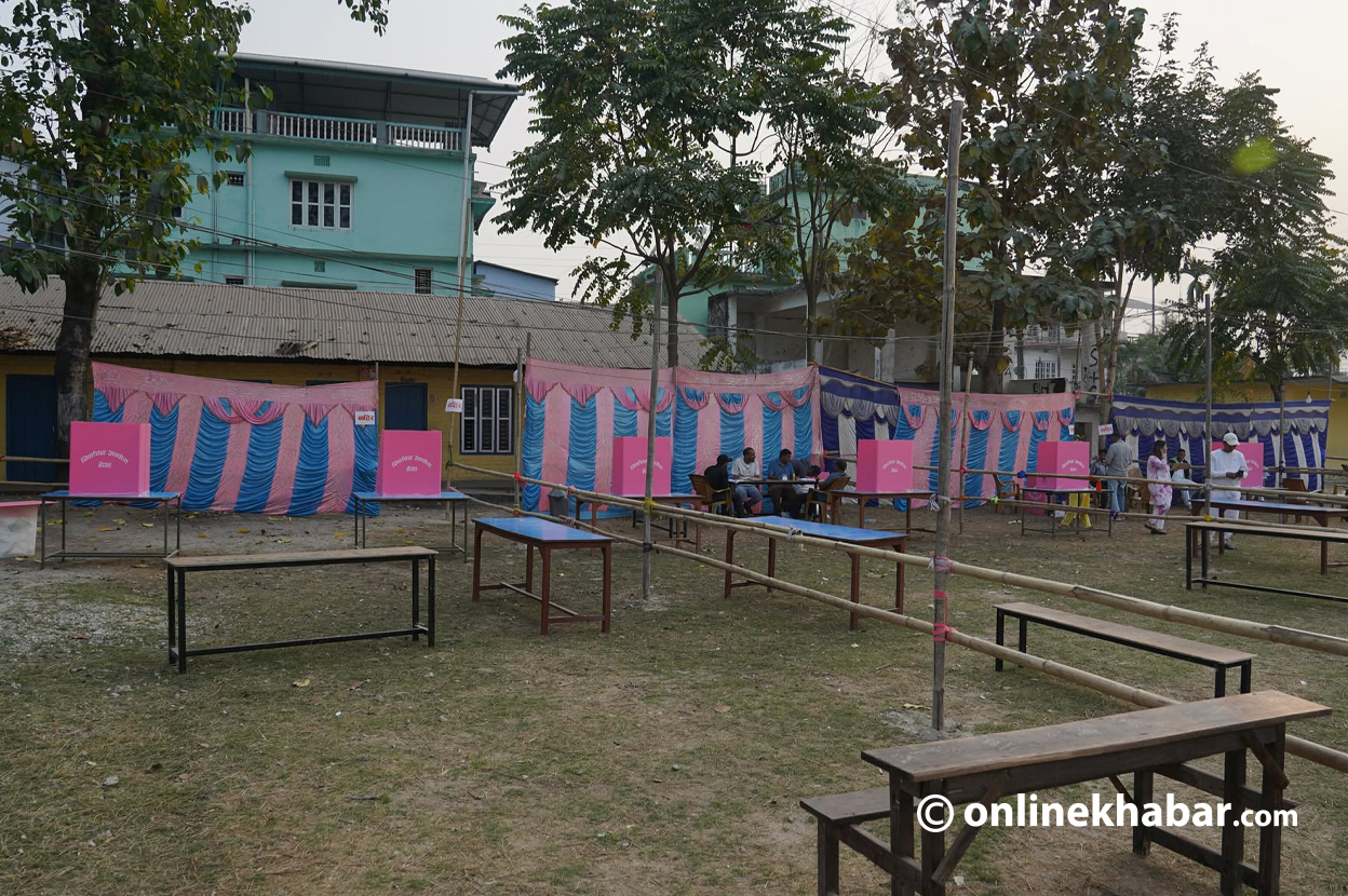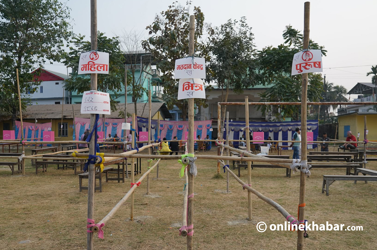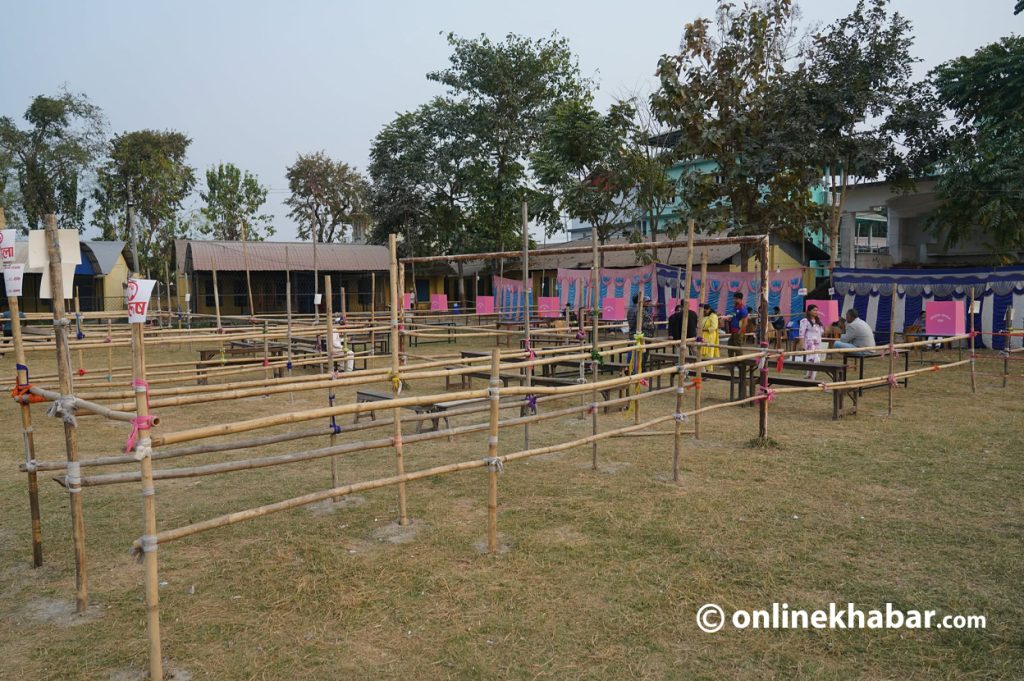 झापाको दमक नगरपालिका–९ स्थित सरस्वति माध्यमिक विद्यालयको खेल मैदानभित्र मतदानका लागि तयारी पूरा भएको छ ।