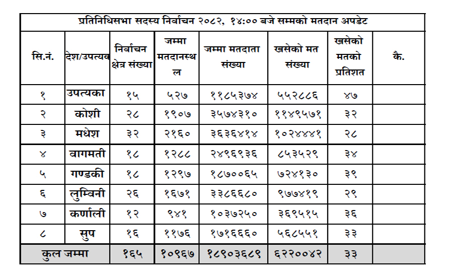 देशभरिका १६५ निर्वाचन क्षेत्रमा दिउँसो २ बजेसम्म ६२ लाख २० हजार ४२ मत खसेको हो । बिहान ७ बजेदेखि मतदान भइरहको छ ।