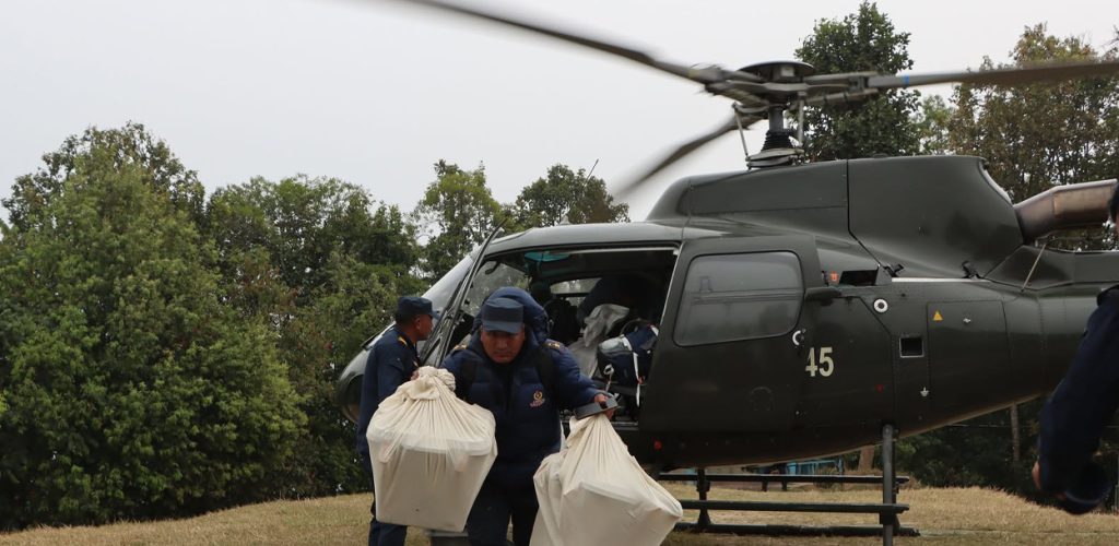 २२ फागुन, सङ्खुवासभा । सङ्खुवासभामा बिहीबार सम्पन्न प्रतिनिधिसभा सदस्य निर्वाचनअन्तरर्गत ४ वटा मतदान केन्द्रको मतपेटीका हेलिकप्टरमार्फत ल्याइएको छ । भौगोलिक रूपमा निकै विकट सडक सञ्जाल नपुगेका भोटखोला र सिलिचोङ गाउँपालिका क्षेत्रका ४ वटा मतदान केन्द्रका मतपेटीका शुक्रबार दिउँसो नेपाली सेनाको हेलिकप्टर मार्फत ल्याइएको हो ।