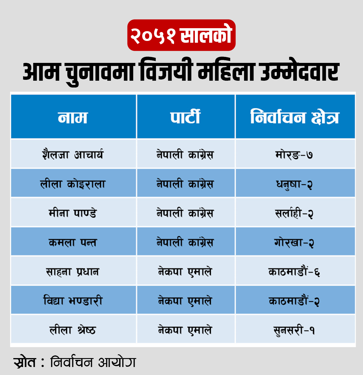 निर्वाचन आयोगका अनुसार, यो निर्वाचनमा एमालेबाट चार, रास्वपाबाट दुई, तथा कांग्रेस, नेकपा (माओवादी केन्द्र) र नागरिक उन्मुक्ति पार्टीबाट एक–एक महिला उम्मेदवार निर्वाचित भएका थिए ।