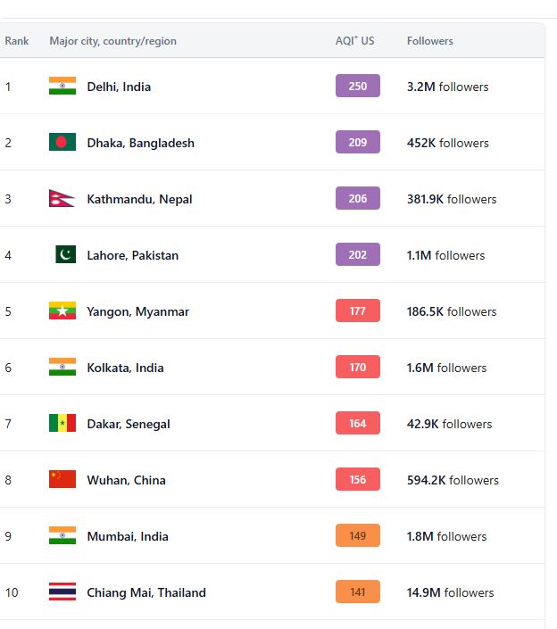 काठमाडौं आज समग्रमा संसारकै अस्वस्थ शहरमध्ये तेस्रो स्थानमा रहेको छ । पहिलो स्थानमा भारतको दिल्ली र दोस्रो स्थानमा बंगलादेशको ढाँका रहेका छन् ।