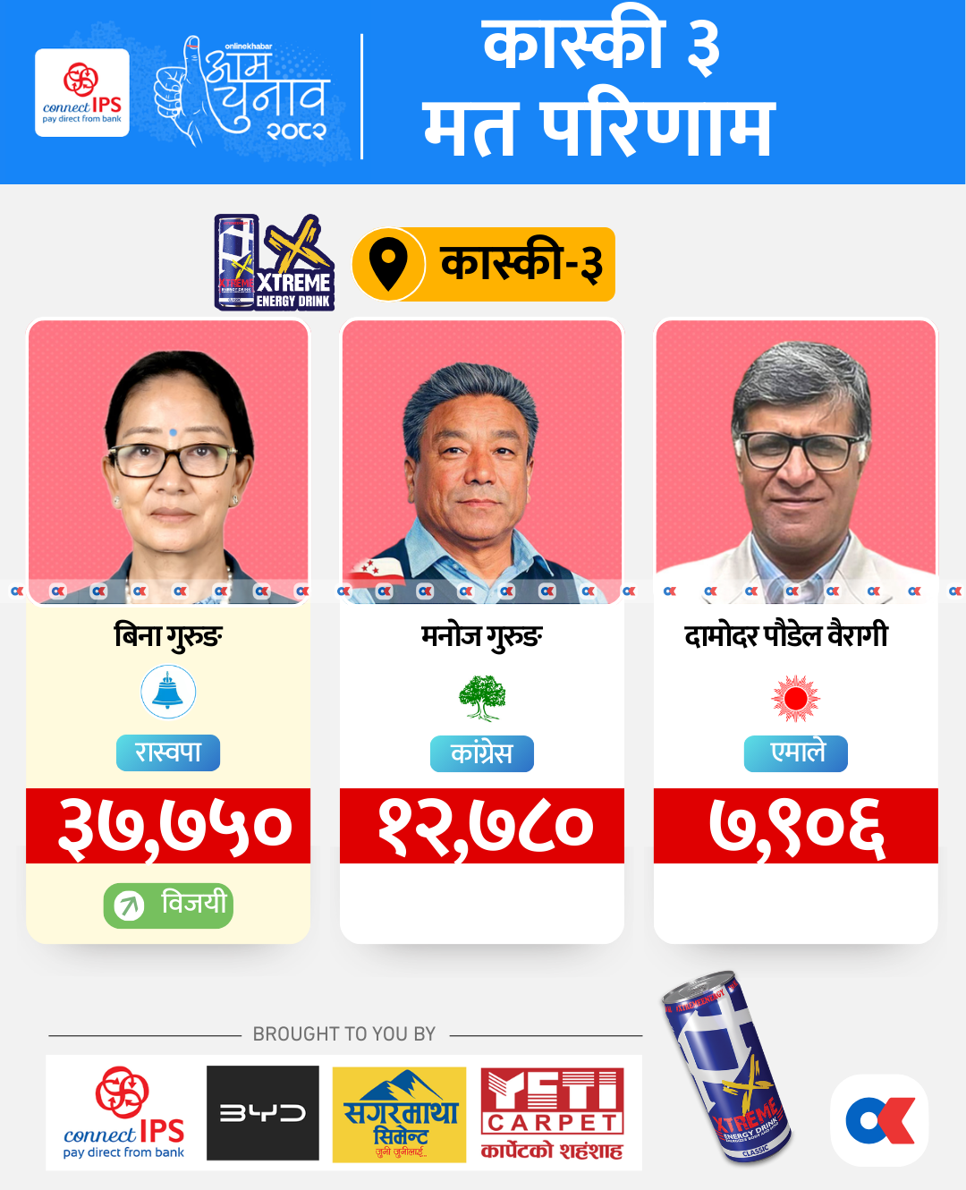 पुराना दलहरुको विकल्पमा खडा भएकी बिनालाई २४ हजार ९७० मतान्तरका साथ कास्की क्षेत्र नम्बर ३ का मतदाताले जिताएका छन् ।