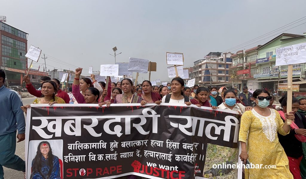 ‘इनिशालाई न्याय देऊ’, ‘दोषीलाई कारबाही गर’ लगायतका नारा लेखिएका प्लेकार्ड सहित प्रर्दशन गरिरहेका उनीहरूले उक्त प्रदर्शनलाई ‘खबरदारी र्याली’ नाम दिएका छन् । महिलाहरूमाथि हुने हिंसा बलात्कार जस्ता जघन्य अपराध रोक्न माग गर्दै प्रर्दशन गरिएका छन् ।