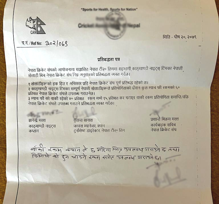 प्रतिबद्धता पत्रमा तत्कालीन समयका लिगको एक टिम काठमाडौं नाइट्सका कप्तान ज्ञानेन्द्र मल्ल, क्यानका कार्यवाहक सचिव प्रशान्त विक्रम मल्ल र टुर्नामेन्ट डाइरेक्टर तथा जनरल म्यानेजर वृत्तान्त खनालले हस्ताक्षर गरेका थिए । ६ महिनामा सबै रकम दिने प्रतिवद्धता जनाएको क्यानले ३ वर्ष बढी समय हुँदासम्म खेलाडीलाई पैसा दिन सकेको छैन ।