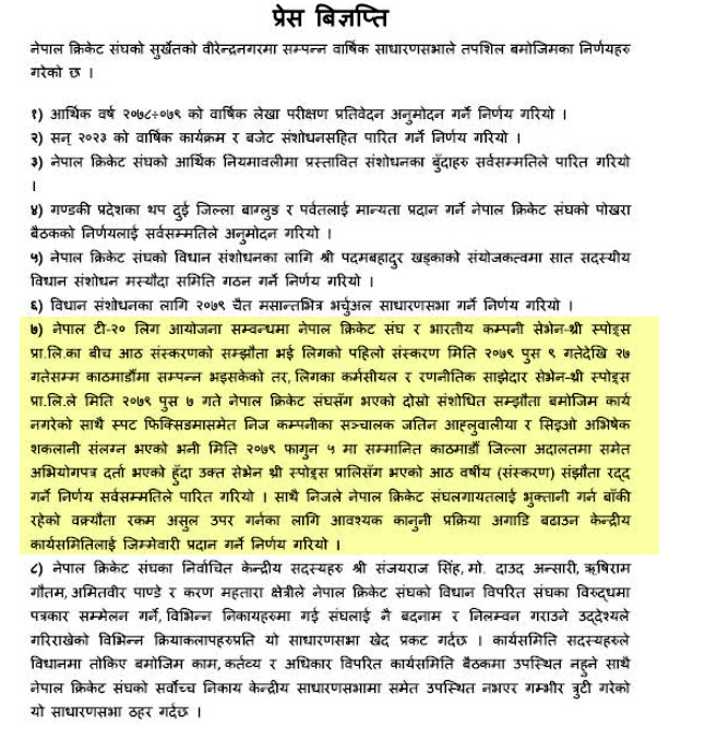 २०८१ असोज ११ र १२ गते पोखरामा भएको साधारण सभाबाट नेपाल टी–२० लिग खेलेका खेलाडीको बाँकी रकम क्यान आफैले तिर्ने एजेण्डा पारित भयो । तर, साधारण सभा सकिएको साढे एक वर्ष बढी समय हुँदासमेत खेलाडीले पैसा पाउन सकेका छैनन् ।