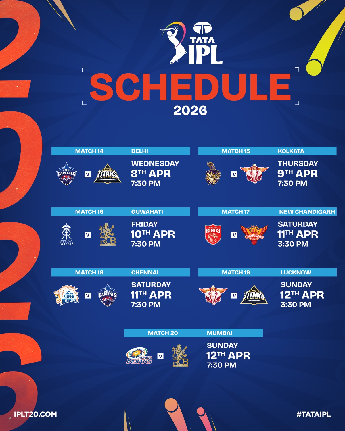 Generated by OK AI. Editorially reviewed.- इन्डियन प्रिमियर लिग २०२६ को पहिलो चरणको खेलतालिका सार्वजनिक भएको छ जसमा २० खेल खेलाइनेछन्।