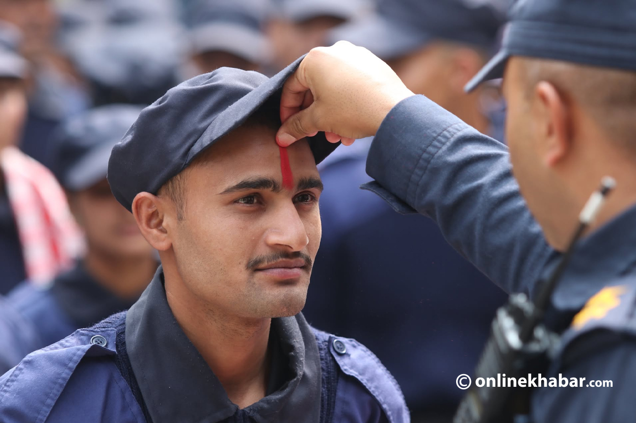 - काठमाडौंको तीनकुनेस्थित प्रहरी वृत्तबाट निर्वाचन प्रहरीहरूलाई टिका र खादा लगाएर बिदाइ गरिएको छ।