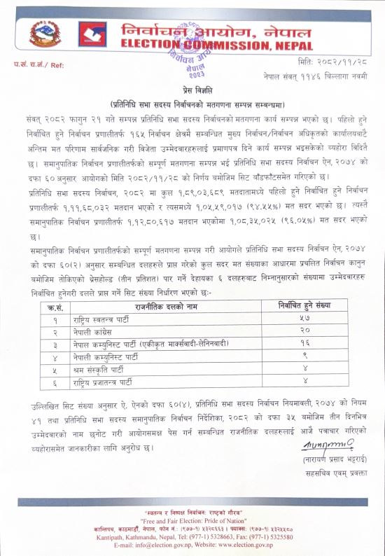 - आयोगले तीन दिनभित्र समानुपातिक उम्मेदवारको नाम छनोट गरी पेस गर्न दलहरूलाई जानकारी गराइसकेको छ।