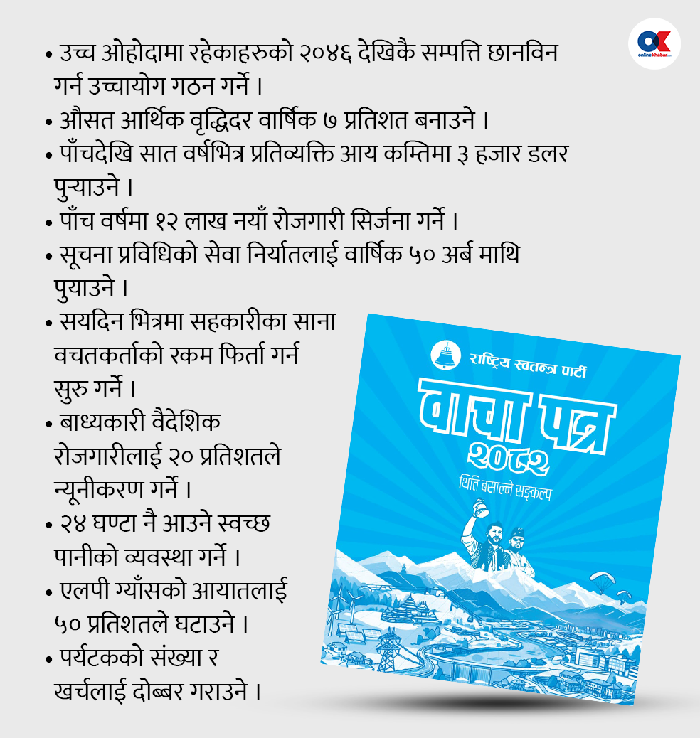 - रास्वपाले सुशासन, शिक्षा, स्वास्थ्य, रोजगारी लगायत क्षेत्रमा समयसीमा तोकेर कार्य गर्ने वाचा गरेको छ।