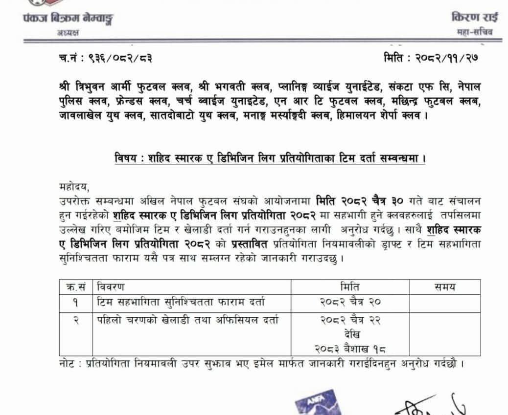 एन्फा महासचिव किरण राईको हस्ताक्षर रहेको पत्रमा ए डिभिजनका १३ क्लबलाई संयुक्त रुपमा सम्बोधन गरिएको छ ।