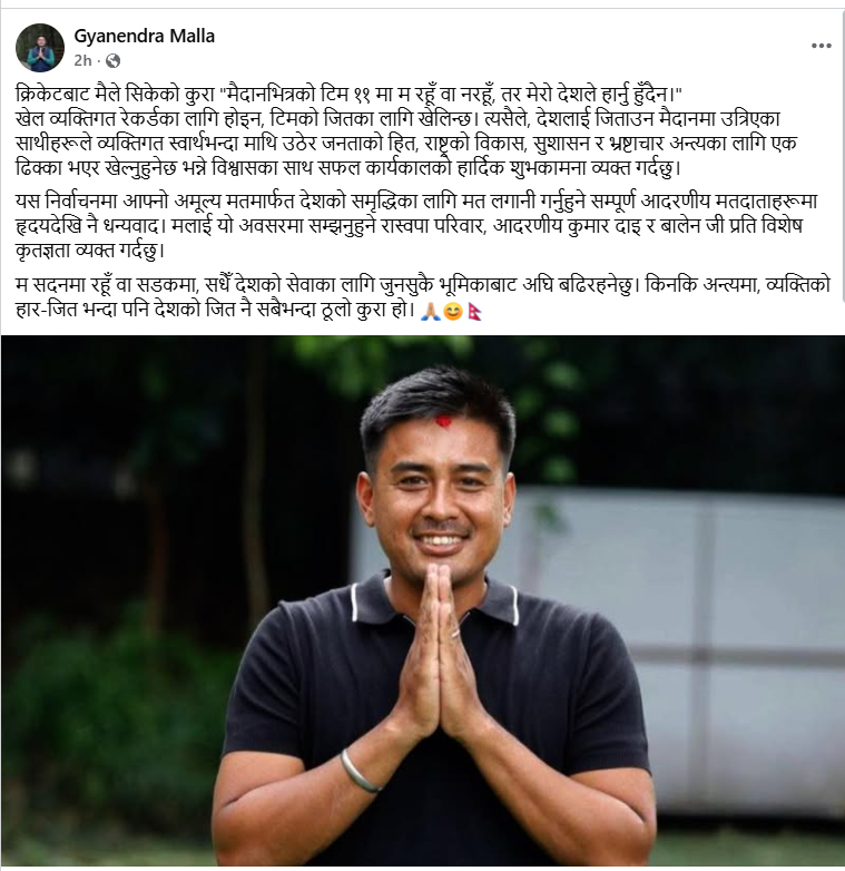 राष्ट्रिय टोलीको कप्तान भइसकेका मल्लले समानुपातिकतर्फ रास्वपाको बन्द सूचीबाट सांसद बनेकाहरूलाई बधाई दिँदै लेखेका छन्, ‘म सदनमा रहुँ वा सडकमा, सधैँ देशको सेवाका लागि जुनसुकै भूमिकाबाट अघि बढिरहनेछु । किनकि अन्त्यमा, व्यक्तिको हार-जितभन्दा पनि देशको जित नै सबैभन्दा ठूलो कुरा हो ।’