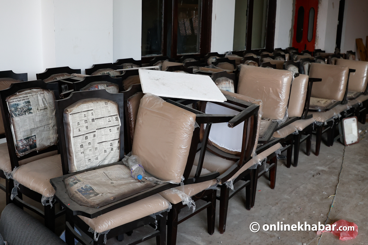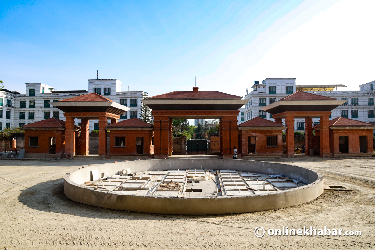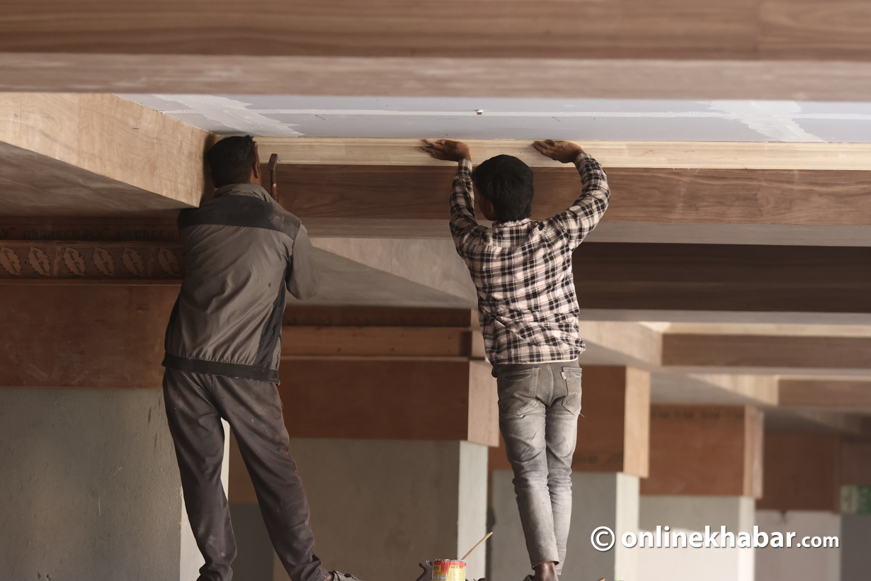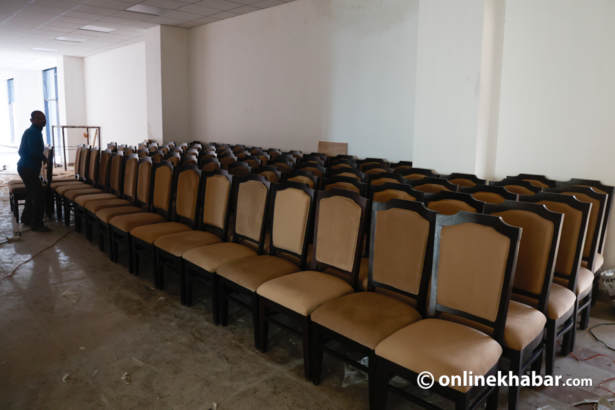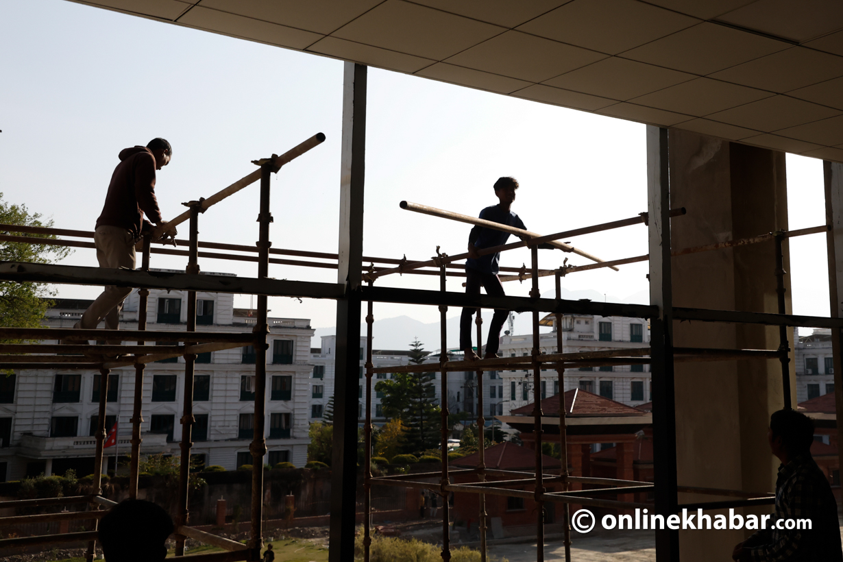 - सिंहदरबारभित्र निर्माणाधीन नयाँ संसद् भवन पूर्ण नभएपछि शपथका लागि कुर्सी, बत्ती र माइक जडान गर्ने काम भइरहेको छ।