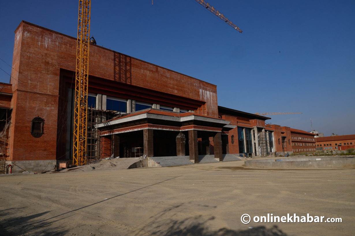 सिंहदरबारभित्र निर्माणाधीन नयाँ संसद् भवन अझै पूर्ण निर्माण भइसकेको छैन । संसद् भवन पूर्ण निर्माण नभएपछि अस्थायी हल तयार पारेर शपथ ग्रहण गराइँदैछ ।
