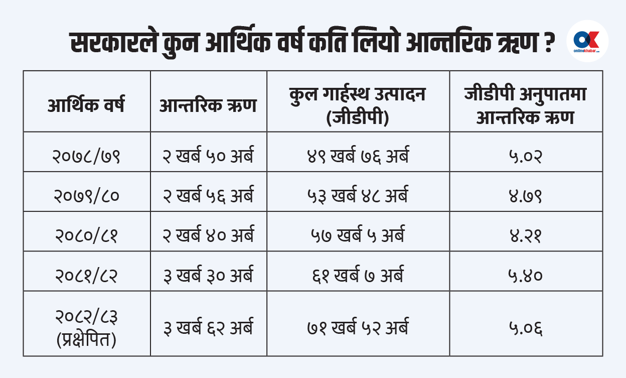 आव २०८१/८२ मा खुद आन्तरिक ऋण परिचालन जीडीपीको १.४१ प्रतिशतमात्र रहेको देखिएको छ । ऋण सेवा खर्च बढ्दै गएका कारण परिचालित अधिकांश आन्तरिक ऋण पुरानो ऋण भुक्तानीमा खर्च भएको हो ।