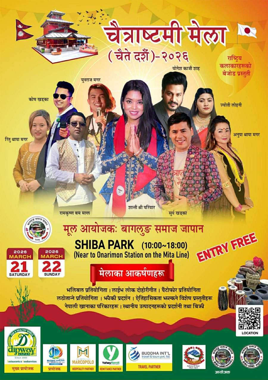 Generated by OK AI. Editorially reviewed.- जापानको टोकियोस्थित शिबा पार्कमा २१ र २२ मार्चमा चैते दशैं मेला आयोजना हुने भएको छ।
